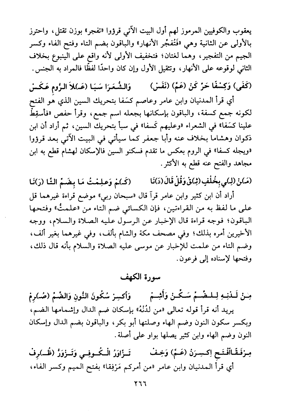 يعقوب والكوفيين المرموز لهم أول البيت الآتي قرءوا «تفجر» بوزن تقتل، واحترز بالأولى عن الثانية وهي «فتفجّر الأنهار» والباقون بضم التاء وفتح الفاء وكسر