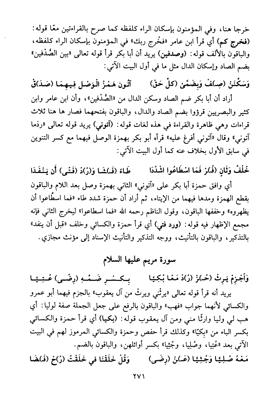 أراد أن أبا بكر ضم الصاد وسكن الدال من «الصّدفين»، وأن ابن عامر وابن كثير والبصريين قرءوا بضم الصاد والدال، والباقون بفتحهما فصار هاهنا ثلاث قراءات وهي ظاهرة والقراءة في هذه لغات قوله: (آتوني) يريد قوله تعالى «رد ما آتوني» وقال «آتوني أفرغ عليه» قرأه أبو بكر بهمزة الوصل فيهما مع كسر التنوين في سابق الأول بخلاف عنه كما أول البيت الآتي: