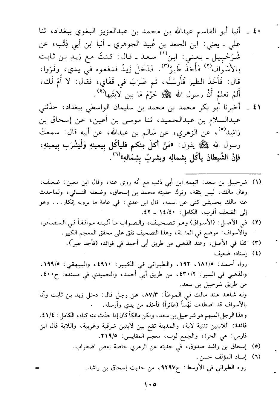 40- أنبا أبو القاسم عبد الله بن محمد بن عبد العزيز البغوي ببغداد، ثنا علي -يعني: ابن الجعد بن عبيد الجوهري- أنبا ابن أبي ذئب، عن شرحبيل -يعني: ابن سعد- قال: كنت مع زيدٍ بن ثابت بالأسواف فأخذ طير، فدخل زيدٌ فدفعوه في يدي، وفروا، قال: فأخذ الطير فأرسله، ثم ضرب في قفاي، فقال: لا أم لك، ألم تعلم أن رسول الله صلى الله عليه وسلم حرم ما بين لابتيها.