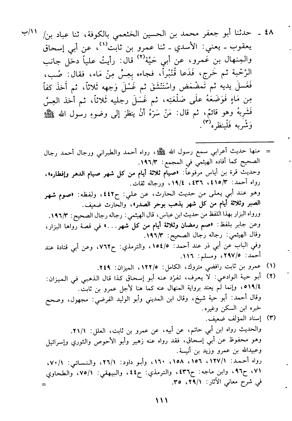 48- حدثنا أبو جعفر محمد بن الحسين الخثعمي بالكوفة، ثنا عباد بن يعقوب -يعني: الأسدي- ثنا عمرو بن ثابت، عن أبي إسحاق والمنهال بن عمرو، عن أبي حية قال: رأيت علياً دخل جانب الرحبة ثم خرج، فدعا قنبراً، فجاءه بعس من ماء، فقال: صب، فغسل يديه ثم تمضمض واستنشق ثم غسل وجهه ثلاثاً، ثم أخذ كفاً من ماءٍ فوضعه على صلعته، ثم غسل رجليه ثلاثاً، ثم أخذ العس فشربه وهو قائمٌ، ثم قال: من سره أن ينظر إلى وضوء رسول الله صلى الله عليه وسلم وشربه فلينظره.