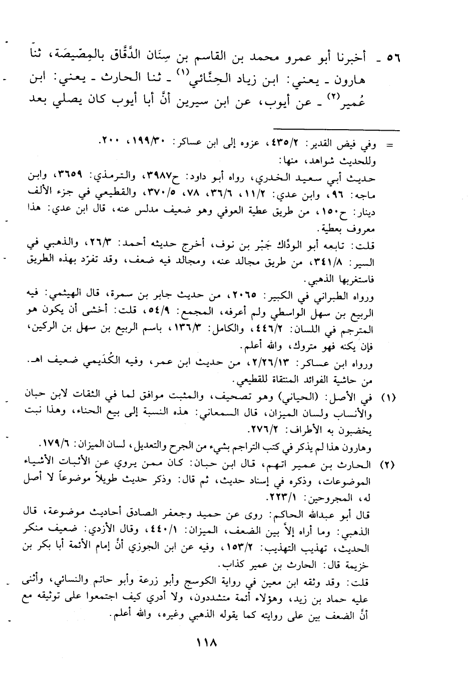 56- أخبرنا أبو عمرو محمد بن القاسم بن سنان الدقاق بالمصيصة، ثنا هارون -يعني: ابن زياد الحنائي- ثنا الحارث -يعني: ابن عمير- عن أيوب، عن ابن سيرين أن أبا أيوب كان يصلي بعد -[119]- العصر ركعتين، فنهاه زيد بن ثابت، فقال: إن الله لا يعذبني على أن أصلي، ولكن يعذبني على أن لا أصلي، فقال: إني آمرك بهذا وأنا أعلم أنك خيرٌ مني، قال: ما عليك بأس أن تصلي ركعتين بعد العصر، ولكني أخاف أن يراك من لا يعلم فيصلي في الساعة التي حرم فيها الصلاة.