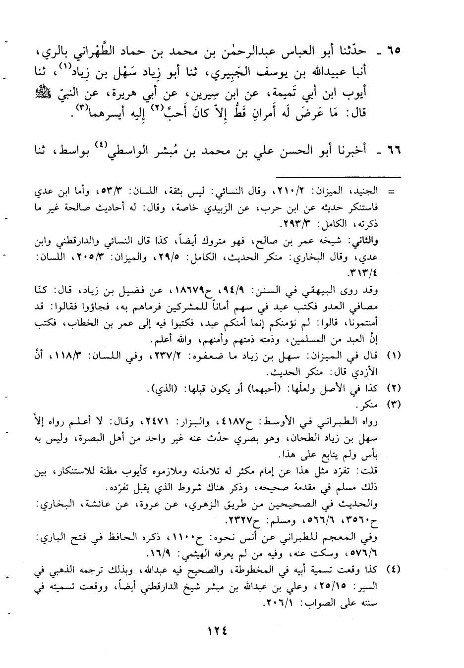 65- حدثنا أبو العباس عبد الرحمن بن محمد بن حماد الطهراني بالري، أنبا عبيد الله بن يوسف الجبيري، ثنا أبو زياد سهل بن زياد، ثنا أيوب بن أبي تميمة، عن ابن سيرين، عن أبي هريرة، عن النبي صلى الله عليه وسلم قال: ما عرض له أمران قط إلا كان أحب إليه أيسرهما.
