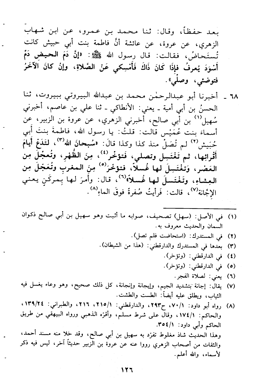 68- أخبرنا أبو عبد الرحمن محمد بن عبد الله البيروتي ببيروت، ثنا الحسن بن أبي أمية -يعني: الأنطاكي- ثنا علي بن عاصم، أخبرني سهيل بن أبي صالح، أخبرني الزهري، عن عروة بن الزبير، عن أسماء بنت عميس قالت: قلت: يا رسول الله، فاطمة بنت أبي حبيش لم تصل منذ كذا وكذا قال: ((سبحان الله، لتدع أيام أقرائها، ثم تغتسل وتصلي، فتؤخر، من الظهر، وتعجل من العصر، وتغتسل لها غسلاً، فتؤخر من المغرب وتعجل من العشاء، وتغتسل لها غسلاً)) ، قال: وأمر لها بمركنٍ يعني الإجانة، قالت: فرأيت صفرةً فوق الماء.