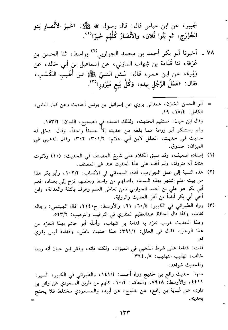 78- أخبرنا أبو بكر أحمد بن محمد الجواربي بواسط، ثنا الحسن بن عرفة، ثنا قدامة بن شهاب المازني، عن إسماعيل بن أبي خالد، عن وبرة، عن ابن عمر، قال: سئل النبي صلى الله عليه وسلم عن أطيب الكسب، فقال: ((عمل الرجل بيده، وكل بيعٍ مبرورٍ)) .