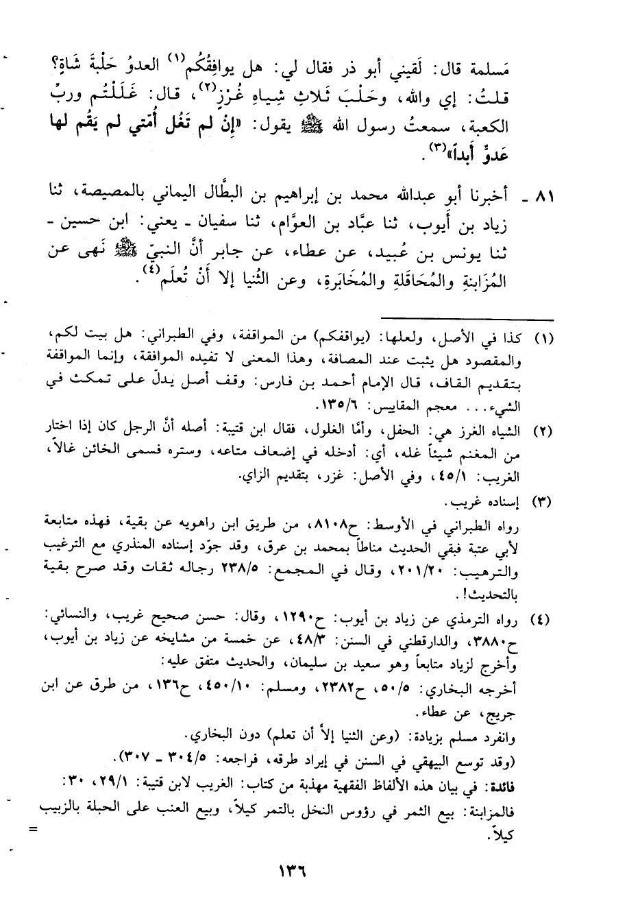 81- أخبرنا أبو عبد الله محمد بن إبراهيم بن البطال اليماني بالمصيصة، ثنا زياد بن أيوب، ثنا عباد بن العوام، ثنا سفيان -يعني: ابن حسين- ثنا يونس بن عبيد، عن عطاء، عن جابر أن النبي صلى الله عليه وسلم نهى عن المزابنة والمحاقلة والمخابرة، وعن الثنيا إلا أن تعلم.