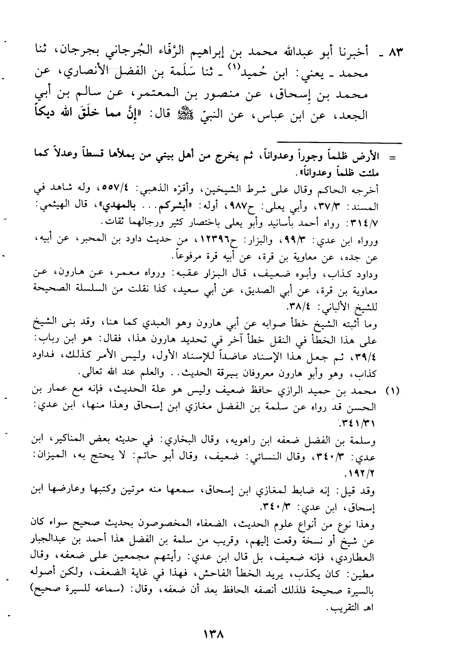 83- أخبرنا أبو عبد الله محمد بن إبراهيم الرفاء الجرجاني بجرجان، ثنا محمد -يعني: ابن حميد- ثنا سلمة بن الفضل الأنصاري، عن محمد بن إسحاق، عن منصور بن المعتمر، عن سالم بن أبي الجعد، عن ابن عباس، عن النبي صلى الله عليه وسلم قال: ((إن مما خلق الله ديكاً -[139]- براثنه على الأرض السابعة، وعرفه منطوٍ حتى العرش، قد أحاط جناحاه بالأفقين، فإذا بقي ثلث الليل الآخر ضرب جناحيه، ثم قال: سبحان الملك القدوس، سبحان الملك القدوس، لا إله غيره، يسمعها ما بين الخافقين إلا الثقلين، قال: فيرون أن الديكة إنما تضرب بأجنحتها وتصيح إذا سمعت ذلك)) .