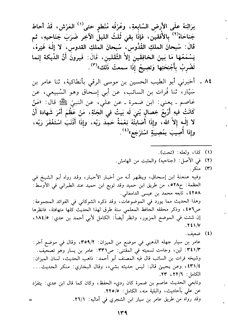 84- أخبرني أبو الطيب الحسين بن موسى الرقي بأنطاكية، ثنا عامر بن سيار، ثنا فرات بن السائب، عن أبي إسحاق وهو السبيعي، عن عاصم -يعني: ابن ضمرة- عن علي، عن النبي صلى الله عليه وسلم قال: ((من كانت فيه أربع خصالٍ بني له بيتٌ في الجنة، من عظم أمر شهادة أن لا إله إلا الله، وإذا أصابته نعمةٌ حمد ربه، وإذا أذنب استغفر ربه، وإذا أصيب بمصيبةٍ استرجع)) .