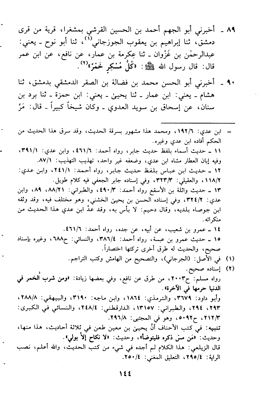 89- أخبرني أبو الجهم أحمد بن الحسين القرشي بمشغرا، قرية من قرى دمشق، ثنا إبراهيم بن يعقوب الجوزجاني، ثنا أبو نوح -يعني: عبد الرحمن بن غزوان- ثنا عكرمة بن عمار، عن نافع، عن ابن عمر قال: قال رسول الله صلى الله عليه وسلم: ((كل مسكرٍ خمرٌ)) .