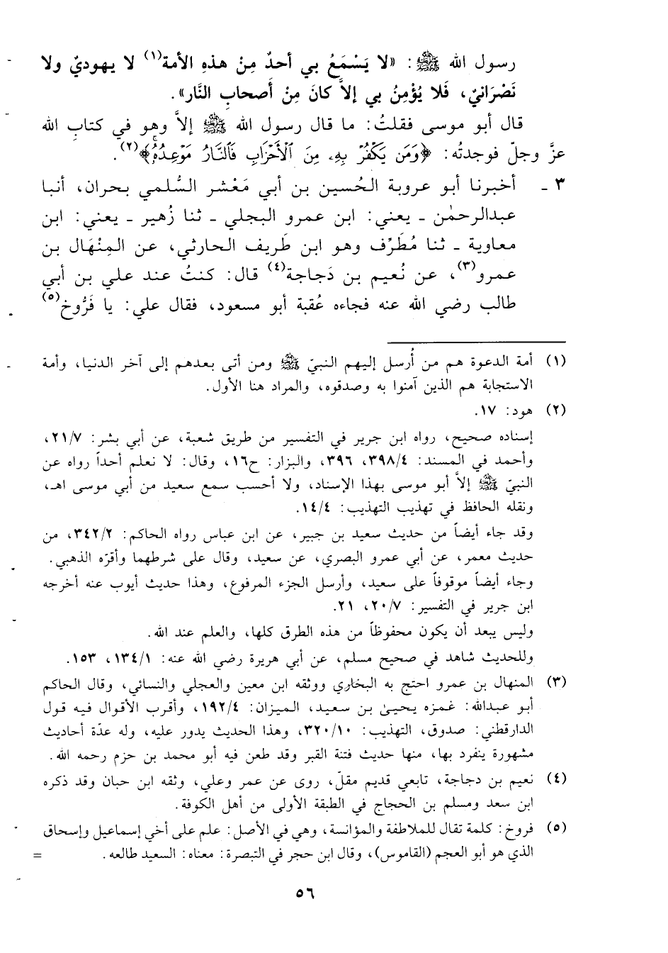 3- أخبرنا أبو عروبة الحسين بن أبي معشر السلمي بحران، أنبا عبد الرحمن -يعني: ابن عمرو البجلي- ثنا زهير -يعني: ابن معاوية- ثنا مطرف وهو ابن طريف الحارثي، عن المنهال بن عمرو، عن نعيم بن دجاجة قال: كنت عند علي بن أبي طالب رضي الله عنه فجاءه عقبة أبو مسعود، فقال علي: يا فروخ -[57]- أما إنك تفتي الناس؟! قال: إنما أخبرهم أن الآخر فالآخر شر، قال: فحدث ما سمعت النبي صلى الله عليه وسلم يقول في المائة، فقال سمعت رسول الله صلى الله عليه وسلم يقول: ((لا يكون مائة سنةٍ وعلى وجه الأرض عينٌ تطرف)) .