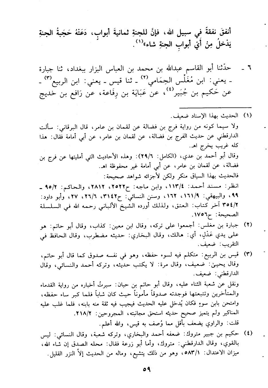 6- حدثنا أبو القاسم عبد الله بن محمد بن العباس البزار ببغداد، ثنا جبارة -يعني: ابن مغلس الحمامي- ثنا قيس -يعني: ابن الربيع- عن حكيم بن جبير، عن عباية بن رفاعة، عن رافع بن خديج -[60]- قال: قال رسول الله صلى الله عليه وسلم: ((المسلمون عند شروطهم فيما أُحِلَّ)) .