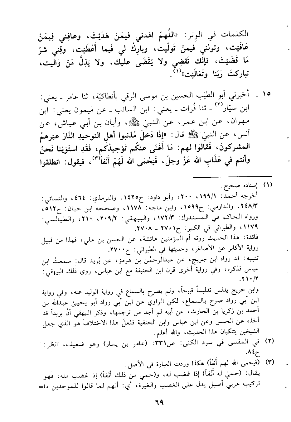 15- أخبرني أبو الطيب الحسين بن موسى الرقي بأنطاكية، ثنا عامر -يعني: ابن سيار- ثنا فرات -يعني: ابن السائب- عن ميمون يعني: ابن مهران، عن ابن عمر، عن النبي صلى الله عليه وسلم، وأبان بن أبي عياش، عن أنس، عن النبي صلى الله عليه وسلم قال: ((إذا دخل مذنبوا أهل التوحيد النار عيرهم المشركون، فقالوا لهم: ما أغنى عنكم توحيدكم، فقد استوينا نحن وأنتم في عذاب الله عز وجل، فيحمى الله لهم أنفاً، فيقول: انطلقوا -[70]- إلى جهنم فمن كان في صدره مثقال شعيرةٍ من إيمانٍ أو مثقال ذرةٍ أو مثقال حبةٍ من خردلٍ أو قالها مرةً من دهره مخلصاً، فأخرجوا منها خلقاً كثيراً، لا يحصيهم إلا الله عز وجل، فاحترقت أيديهم وأرجلهم، ونحلت أبدانهم، ولم تصل النار إلى وجوههم إكراماً للتوحيد، فيأتون عيناً من عيون الجنة، فيشربون من أحديها فينقى ما في بطونهم من أذى أو داءٍ، ويغتسلون بالأخرى فتنبت لحومهم على خصال أهل الجنة، فيسمون الجهنميون ما شاء الله، ثم يكرهون هذا الاسم، فيسألون الرب جل جلاله أن يضعه عنهم فيفعل، حتى ما يعرفون من غيرهم، فعند ذلك من بقي في النار يقول: {ربما يود الذين كفروا لو كانوا مسلمين} ويوقنون بالخلود، ويدعون بالويل والثبور)) .