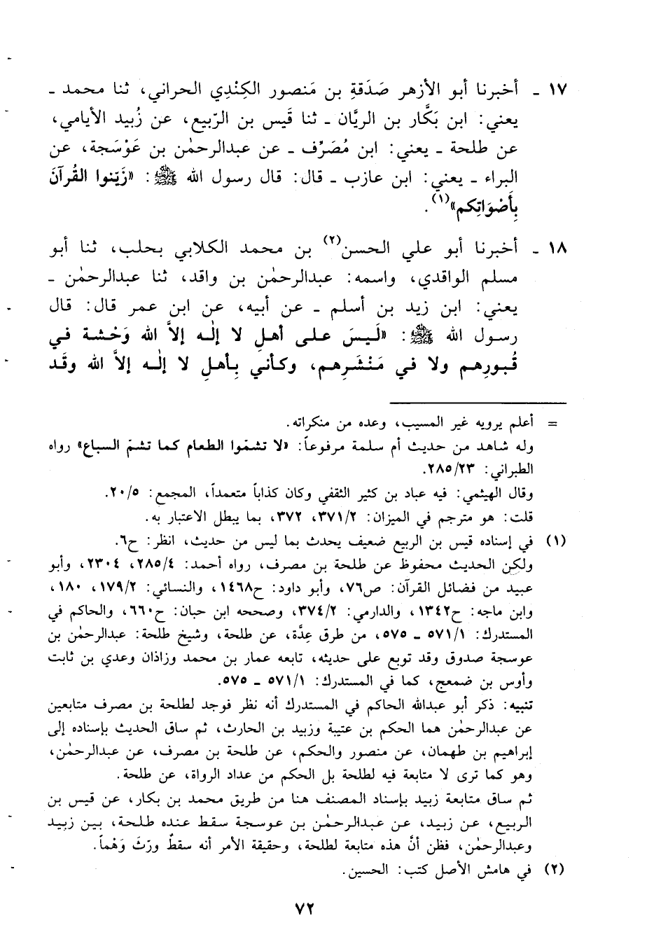 17- أخبرنا أبو الأزهر صدقة بن منصور الكندي الحراني، ثنا محمد -يعني: ابن بكار بن الريان- ثنا قيس بن الربيع، عن زبيد الأيامي، عن طلحة -يعني: ابن مصرف- عن عبد الرحمن بن عوسجة، عن البراء -يعني: ابن عازب- قال: قال رسول الله صلى الله عليه وسلم: ((زينوا القرآن بأصواتكم)) .