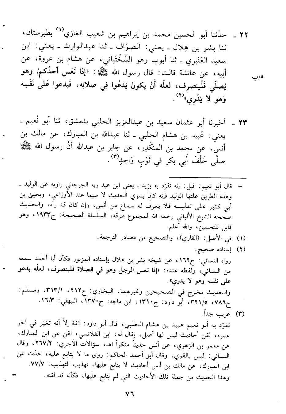 23- أخبرنا أبو عثمان سعيد بن عبد العزيز الحلبي بدمشق، ثنا أبو نعيم -يعني: عبيد بن هشام الحلبي- ثنا عبد الله بن المبارك، عن مالك بن أنس، عن محمد بن المنكدر، عن جابر بن عبد الله أن رسول الله صلى الله عليه وسلم صلى خلف أبي بكر في ثوبٍ واحدٍ.