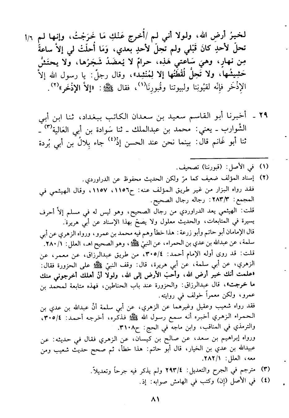 29- أخبرنا أبو القاسم سعيد بن سعدان الكاتب ببغداد، ثنا ابن أبي الشوارب -يعني: محمد بن عبد الملك- ثنا سوادة بن أبي العالية - ثنا أبو غانم قال: بينما نحن عند الحسن إذ جاء بلال بن أبي بردة -[82]- فاستأذن على الحسن، فقال: ما لي ولبلال ثلاث مرات، قال: إئذن له، قال: فدخل بلال على الحسن ولم يدخل معه من الناس، فقعد مع الحسن على مجلسه، فسأله ثم أخذ بيد الحسن فوضعها في حجره، فقال بلال: يا أبا سعيد ألا أحدثك بحديثٍ حدثني به أبو بردة، عن أبي موسى الأشعري، عن رسول الله صلى الله عليه وسلم، قال: ((ما من عبدٍ ابتلي ببليةٍ في الدنيا بذنبٍ، والله جل وعز أكرم وأعظم عفواً من أن يسأله عن ذلك الذنب يوم القيامة)) .