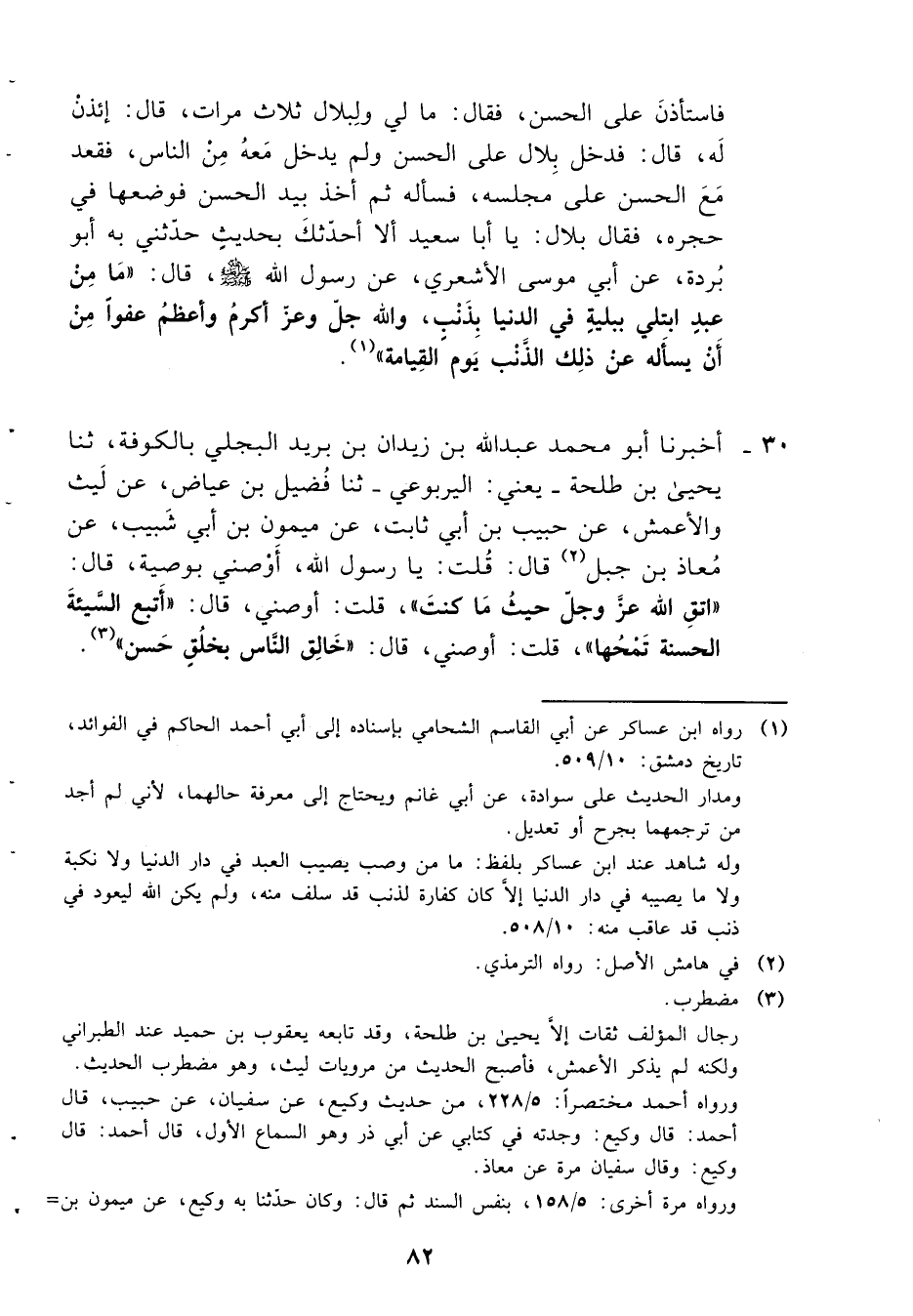 30- أخبرنا أبو محمد عبد الله بن زيدان بن بريد البجلي بالكوفة، ثنا يحيى بن طلحة -يعني: اليربوعي- ثنا فضيل بن عياض، عن ليث والأعمش، عن حبيب بن أبي ثابت، عن ميمون بن أبي شبيب، عن معاذ بن جبل قال: قلت: يا رسول الله، أوصني بوصية، قال: ((اتق الله عز وجل حيث ما كنت)) ، قلت: أوصني، قال: ((أتبع السيئة الحسنة تمحها)) . قلت: أوصني، قال ((خالق الناس بخلقٍ حسن)) .