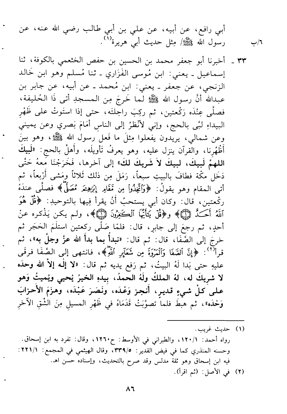 33- أخبرنا أبو جعفر محمد بن الحسين بن حفص الخثعمي بالكوفة، ثنا إسماعيل -يعني: ابن موسى الفزاري- ثنا مسلم وهو ابن خالد الزنجي، عن جعفر -يعني: ابن محمد- عن أبيه، عن جابر بن عبد الله أن رسول الله صلى الله عليه وسلم لما خرج من المسجد أتى ذا الحليفة، فصلى عنده ركعتين، ثم ركب راحلته، حتى إذا استوت على ظهر البيداء لبى بالحج، وإني لأنظر إلى الناس أمام بصري وعن يميني وعن شمالي، يريدون يفعلوا مثل ما فعل رسول الله صلى الله عليه وسلم، وهو بين أظهرنا، والقرآن ينزل عليه، وهو يعرف تأويله، وأهل بالحج: ((لبيك اللهم لبيك، لبيك لا شريك لك)) إلى آخرها، فخرجنا معه حتى دخل مكة فطاف بالبيت سبعاً، رمل من ذلك ثلاثاً ومشى أربعاً، ثم أتى المقام وهو يقول: {واتخذوا من مقام إبراهيم مصلى} فصلى عنده ركعتين، قال: وكان أبي يستحب أن يقرأ فيها بالتوحيد: {قل هو الله أحد} و {قل يا أيها الكافرون} ، ولم يكن يذكره عن أحدٍ،
