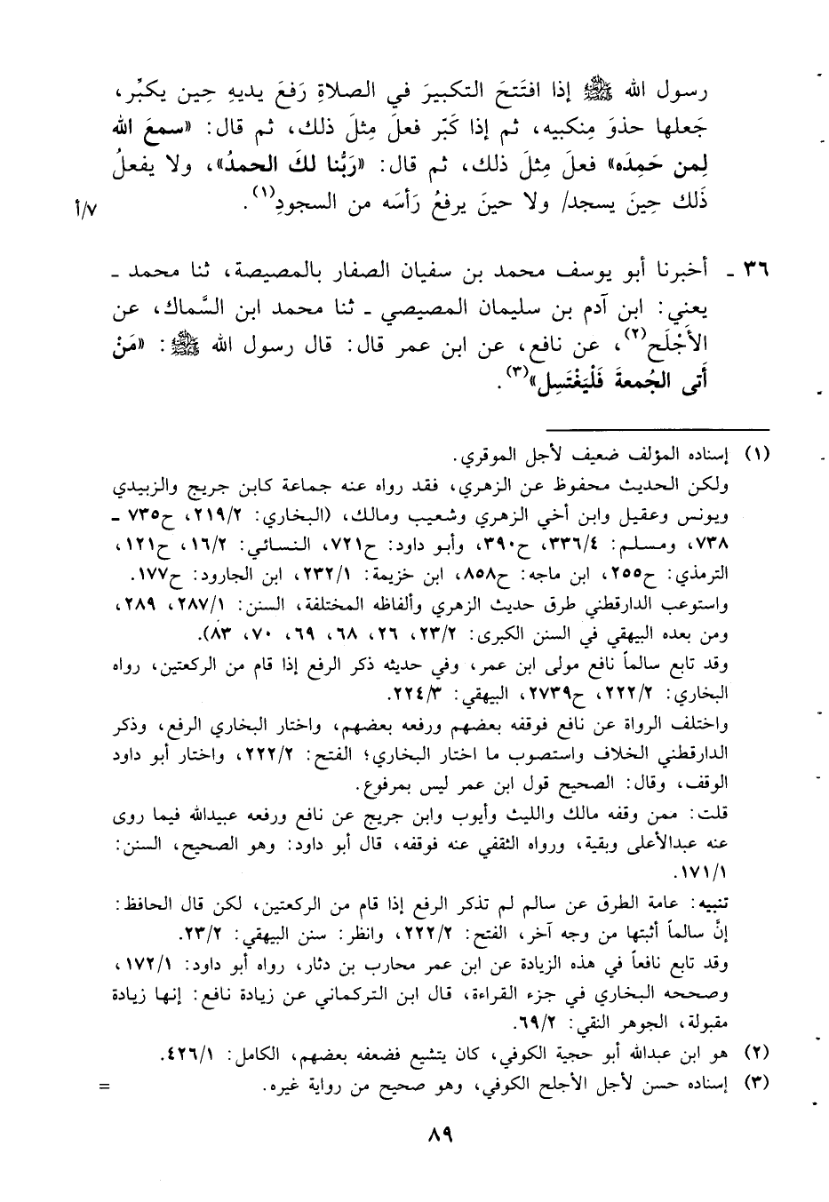 36- أخبرنا أبو يوسف محمد بن سفيان الصفار بالمصيصة، ثنا محمد -يعني: ابن آدم بن سليمان المصيصي- ثنا محمد ابن السماك، عن الأجلح، عن نافع، عن ابن عمر قال: قال رسول الله صلى الله عليه وسلم: ((من أتى الجمعة فليغتسل)) .