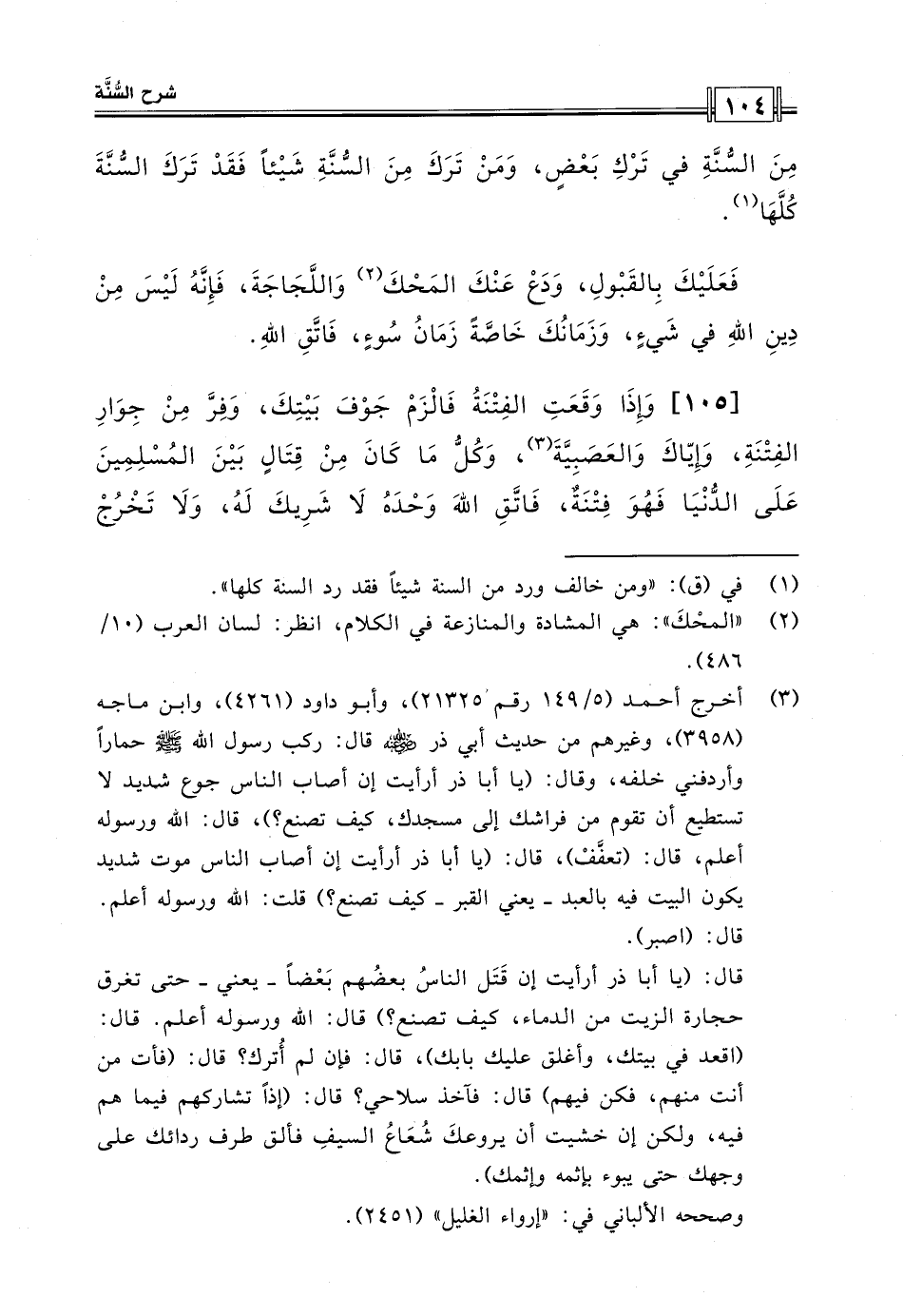 [105] وإذا وقعت الفتنة فالزم جوف بيتك، وفر من جوار الفتنة، وإياك والعصبية، وكل ما كان من قتال بين المسلمين على الدنيا فهو فتنة، فاتق الله وحده لا شريك له، ولا تخرج