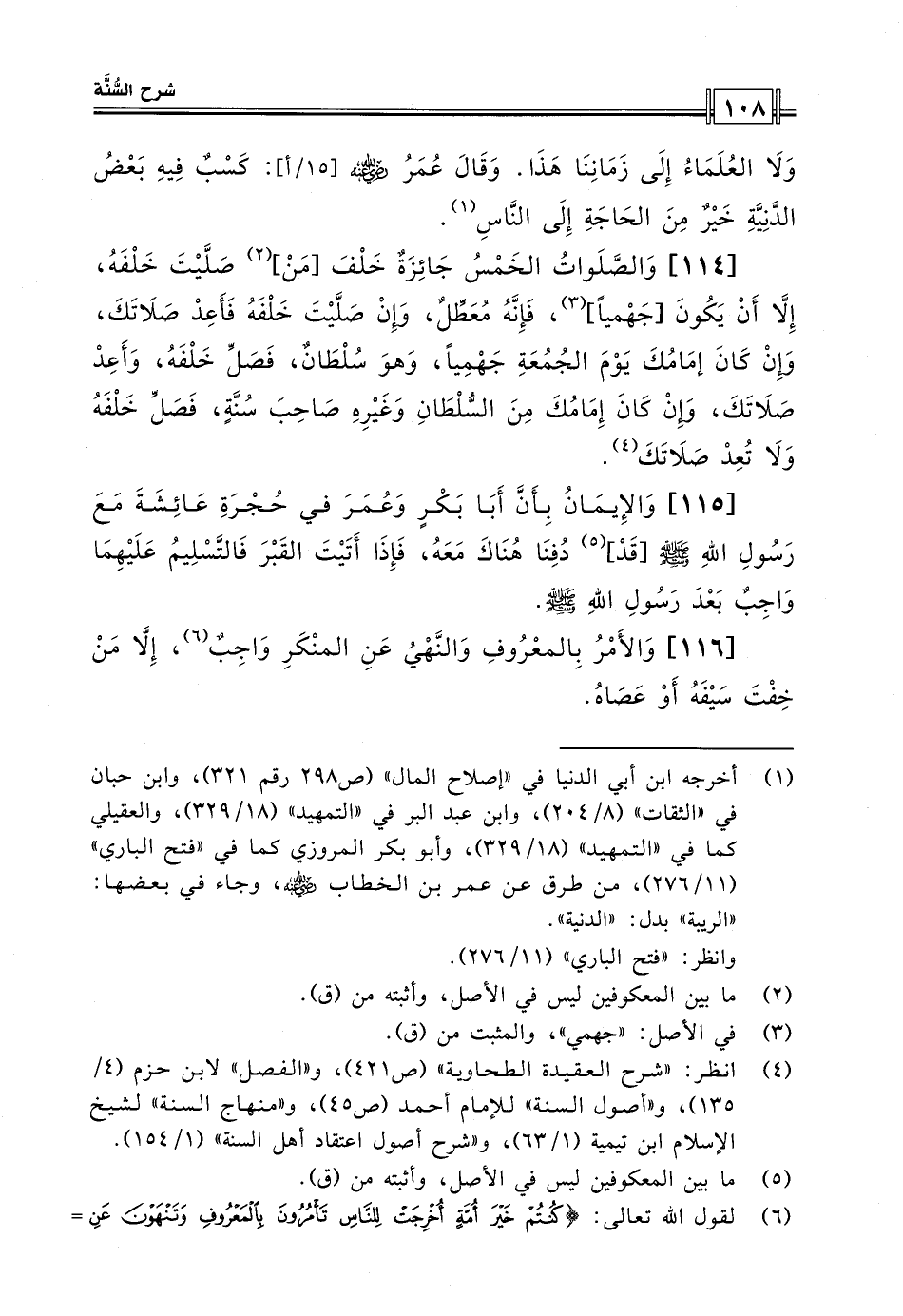 [115] والإيمان بأن أبا بكر وعمر في حجرة عائشة مع رسول الله صلى الله عليه وسلم [قد] دفنا هنالك معه، فإذا أتيت القبر فالتسليم عليهما واجب بعد رسول الله صلى الله عليه وسلم.