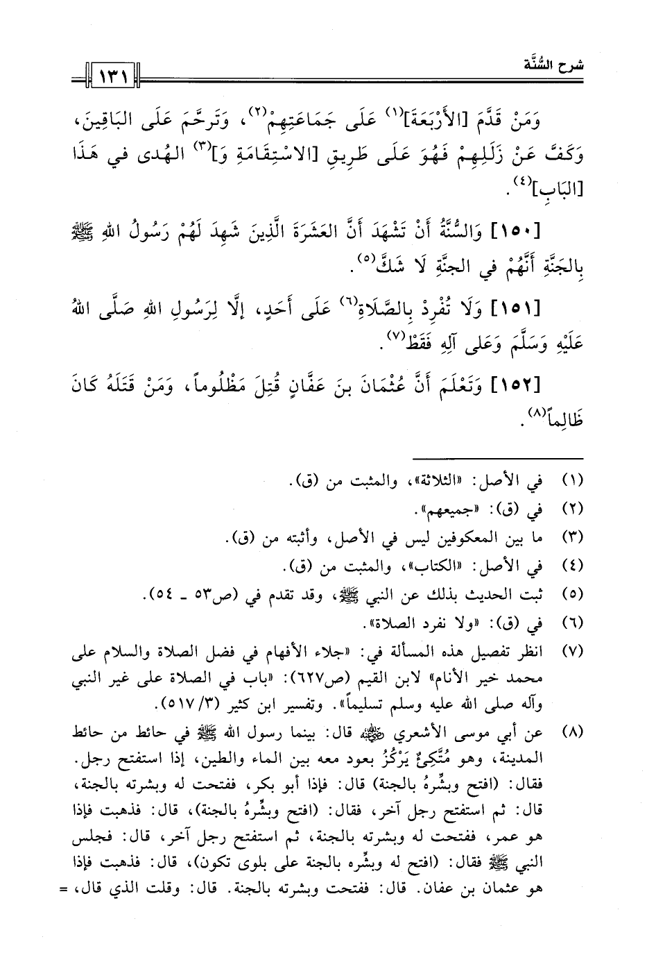 [150] والسنة أن تشهد العشرة الذين شهد لهم رسول الله صلى الله عليه وسلم بالجنة أنهم في الجنة لا شك.