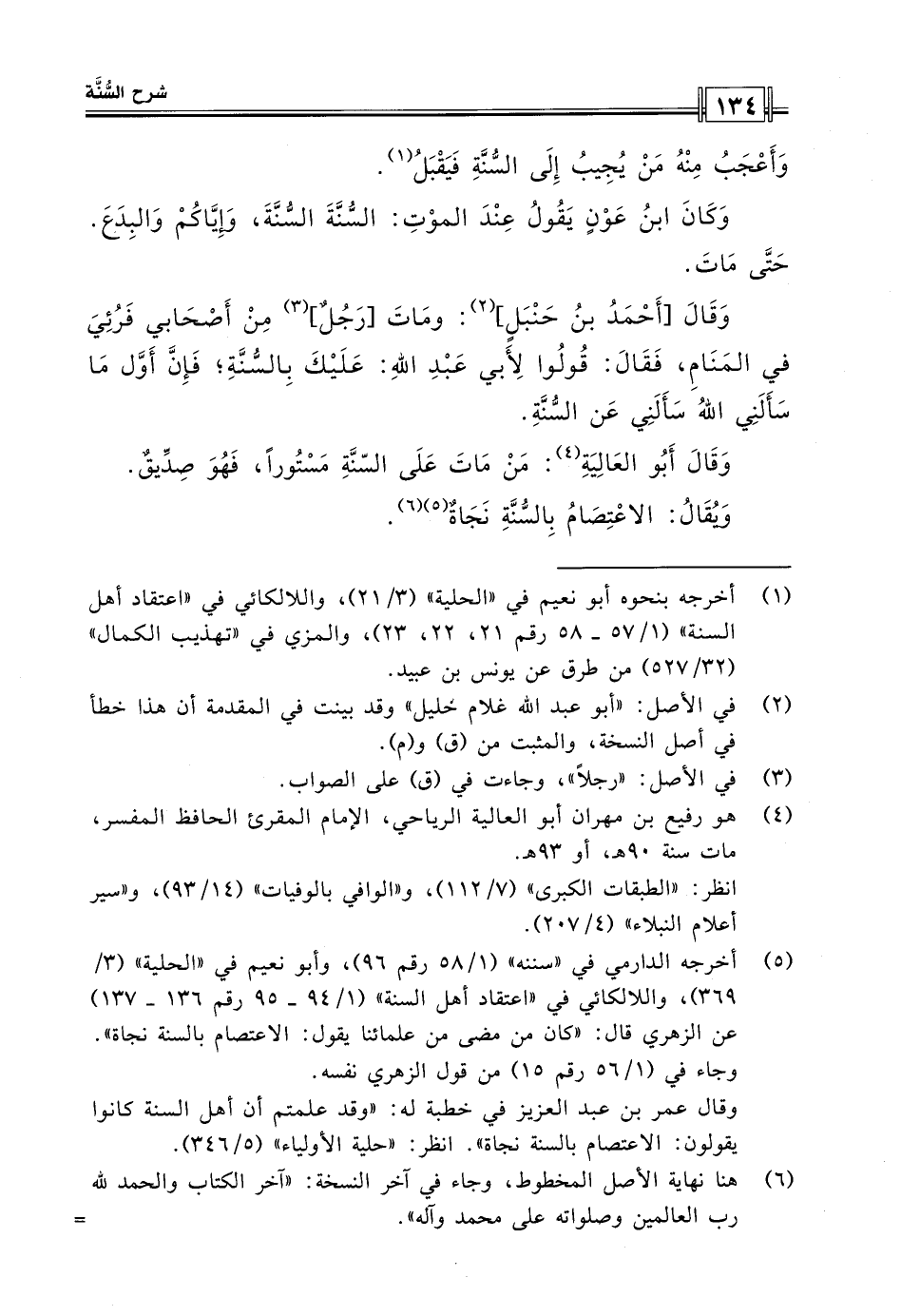 وقال [أحمد بن حنبل] : ومات [رجل] من أصحابي فرئي في المنام، فقال: قولوا لأبي عبد الله: عليك بالسنة؛ فإن أول ما سألني الله سألني عن السنة.