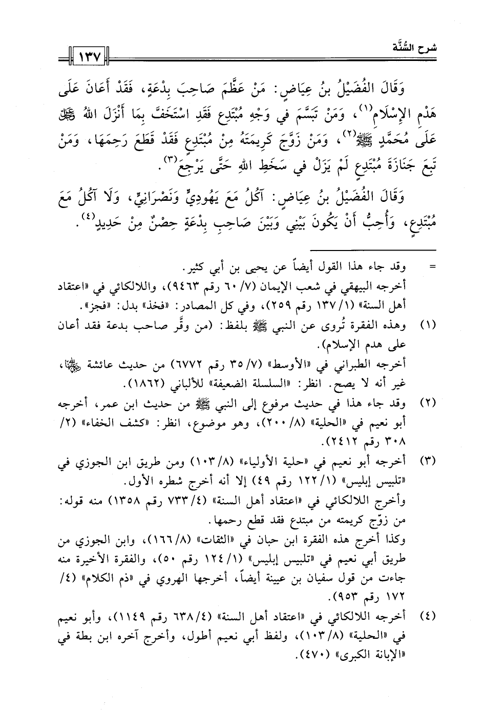 وقال الفضيل بن عياض: آكل مع يهودي ونصراني، ولا آكل مع مبتدع، وأحب أن يكون بيني وبين صاحب بدعة حصن من حديد.