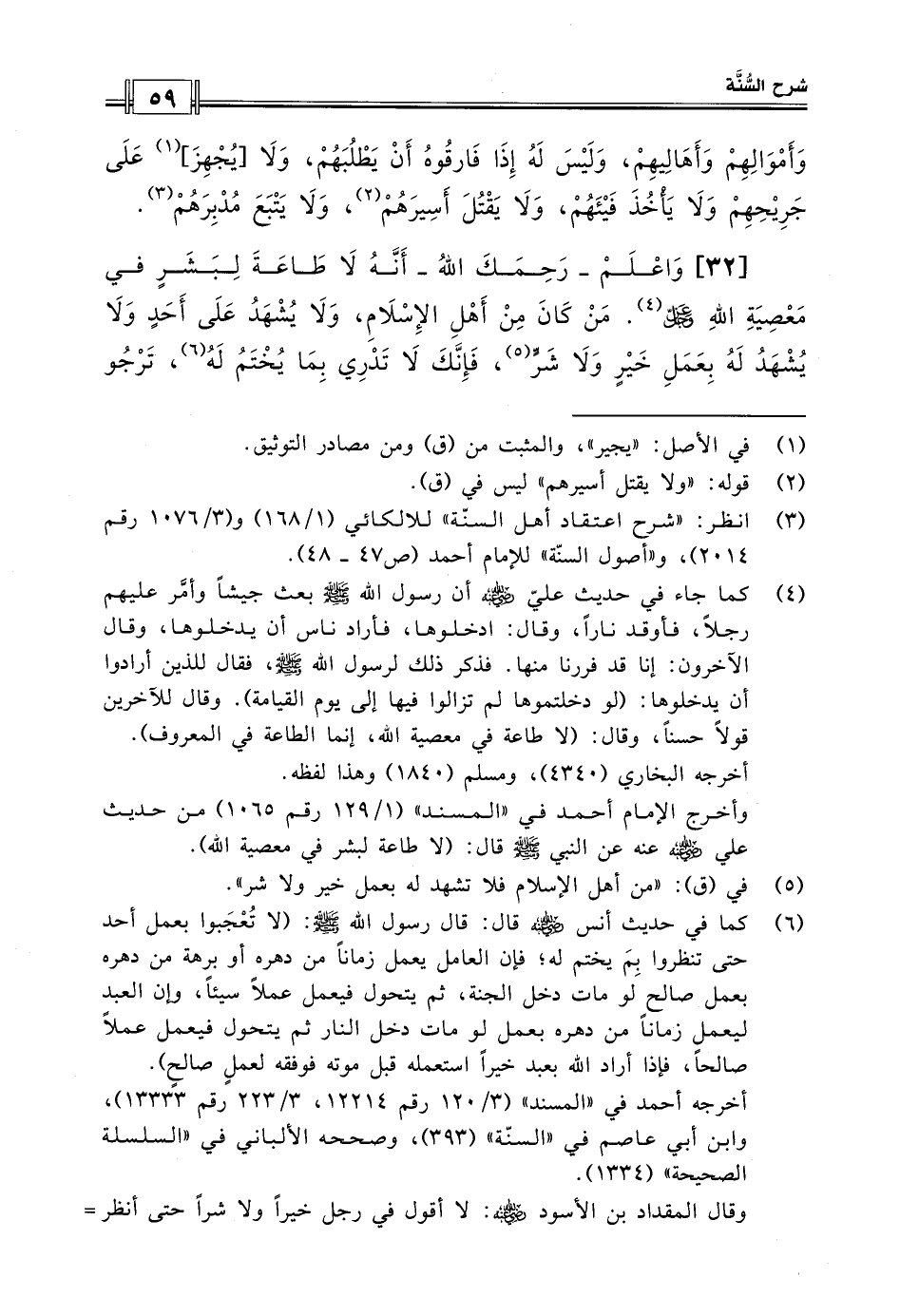 [32] واعلم – رحمك الله - أنه لا طاعة لبشر في معصية الله عز وجل. من كان من أهل الإسلام، ولا يشهد على أحد ولا يشهد له بعمل خير ولا شر، فإنك لا تدري بما يختم له، ترجو