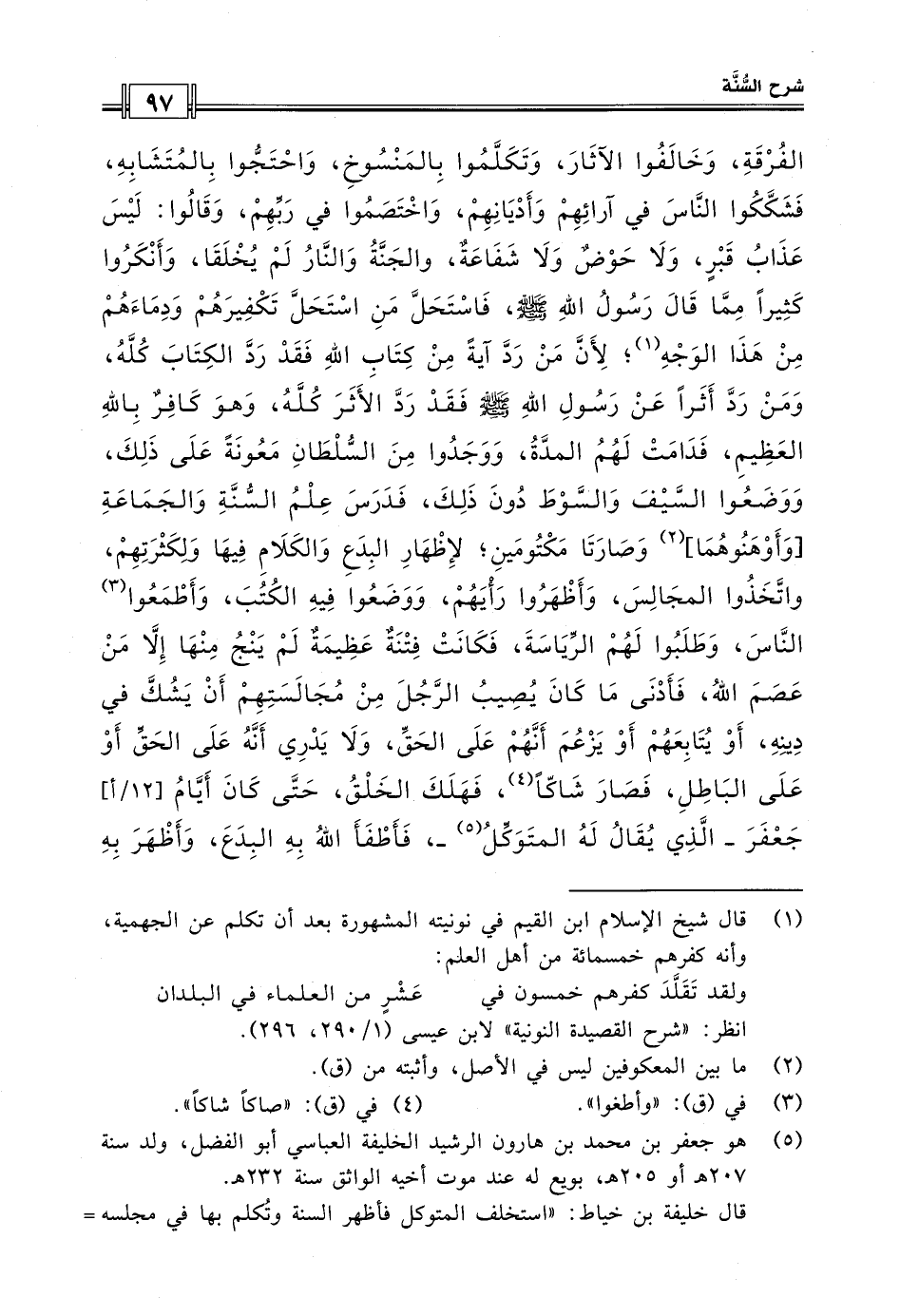 الفرقة، وخالفوا الآثار، وتكلموا بالمنسوخ، واحتجوا بالمتشابه، فشككوا الناس في آرائهم وأديانهم، واختصموا في ربهم، وقالوا: ليس عذاب قبر، ولا حوض ولا شفاعة، والجنة والنار لم يخلقا، وأنكروا كثيرا مما قال رسول الله صلى الله عليه وسلم، فاستحل من استحل تكفيرهم ودماءهم من هذا الوجه؛ لأن من رد آية من كتاب الله فقد رد الكتاب كله، ومن رد أثرا عن رسول الله صلى الله عليه وسلم فقد رد الأثر كله، وهو كافر بالله العظيم، فدامت لهم المدة، ووجدوا من السلطان معونة على ذلك، ووضعوا السيف والسوط دون ذلك، فدرس علم السنة والجماعة [وأوهنوهما] وصارتا مكتومين؛ لإظهار البدع والكلام فيها ولكثرتهم، واتخذوا المجالس، وأظهروا رأيهم، ووضعوا فيها الكتب، وأطمعوا الناس، وطلبوا لهم الرياسة، فكانت فتنة عظيمة لم ينج منها إلا من عصم الله، فأدنى ما كان يصيب الرجل من مجالستهم أن يشك في دينه، أو يتابعهم أو يزعم أنهم على الحق، ولا يدري أنه على الحق أو على الباطل، فصار شاكا، فهلك الخلق، حتى كان أيام جعفر - الذي يقال له المتوكل - فأطفأ الله به البدع، وأظهر به
