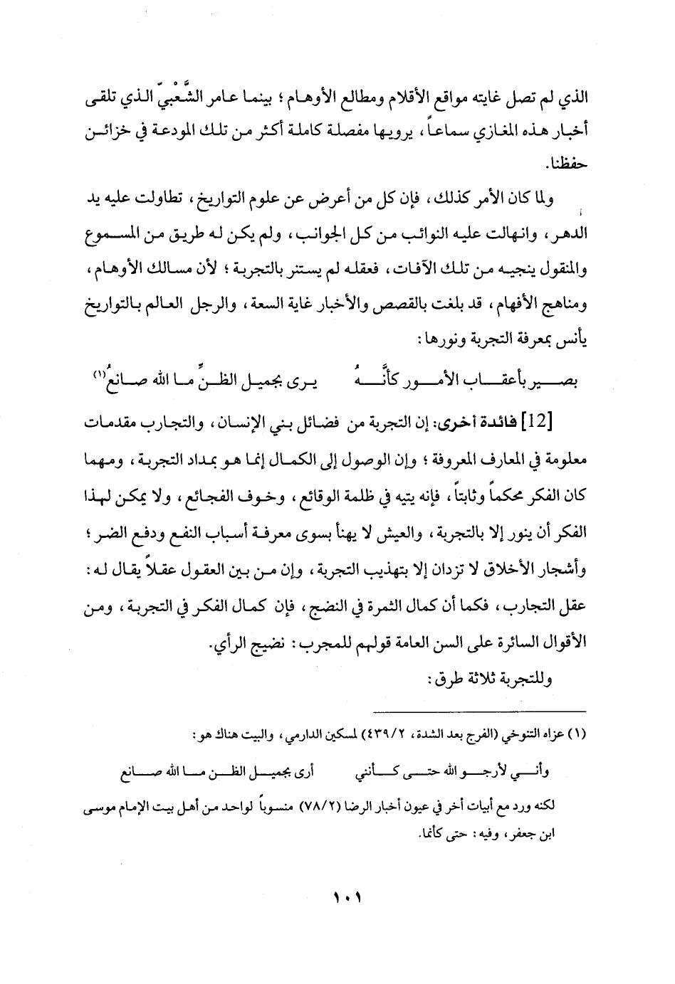 [12] فائدة أخرى: إن التجربة من فضائل بني الإنسان، والتجارب مقدمات معلومة في المعارف المعروفة؛ وإن الوصول إلى الكمال إنما هو بمداد التجربة، ومهما كان الفكر محكما وثابتا، فإنه يتيه في ظلمة الوقائع، وخوف الفجائع، ولا يمكن لهذا الفكر أن ينور إلا بالتجربة، والعيش لا يهنأ بسوى معرفة أسباب النفع ودفع الضر؛ وأشجار الأخلاق لا تزدان إلا بتهذيب التجربة، وإن من بين العقول عقلا يقال له: