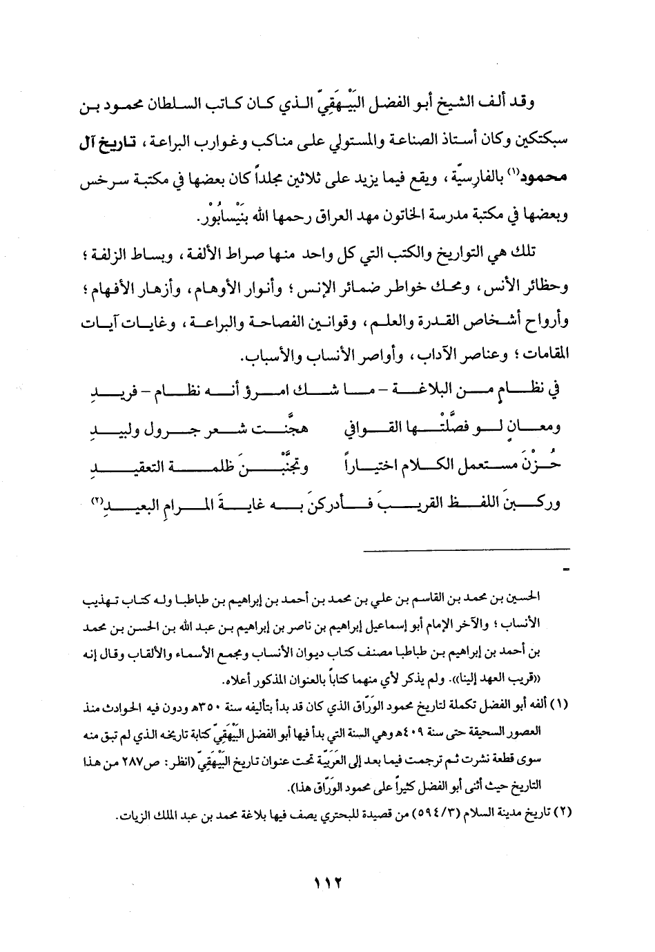 وقد ألف الشيخ أبو الفضل البيهقيّ الذي كان كاتب السلطان محمود بن سبكتكين وكان أستاذ الصناعة والمستولي على مناكب وغوارب البراعة، تاريخ آل محمود «1» بالفارسيّة، ويقع فيما يزيد على ثلاثين مجلدا كان بعضها في مكتبة سرخس وبعضها في مكتبة مدرسة الخاتون مهد العراق رحمها الله بنيسابور.