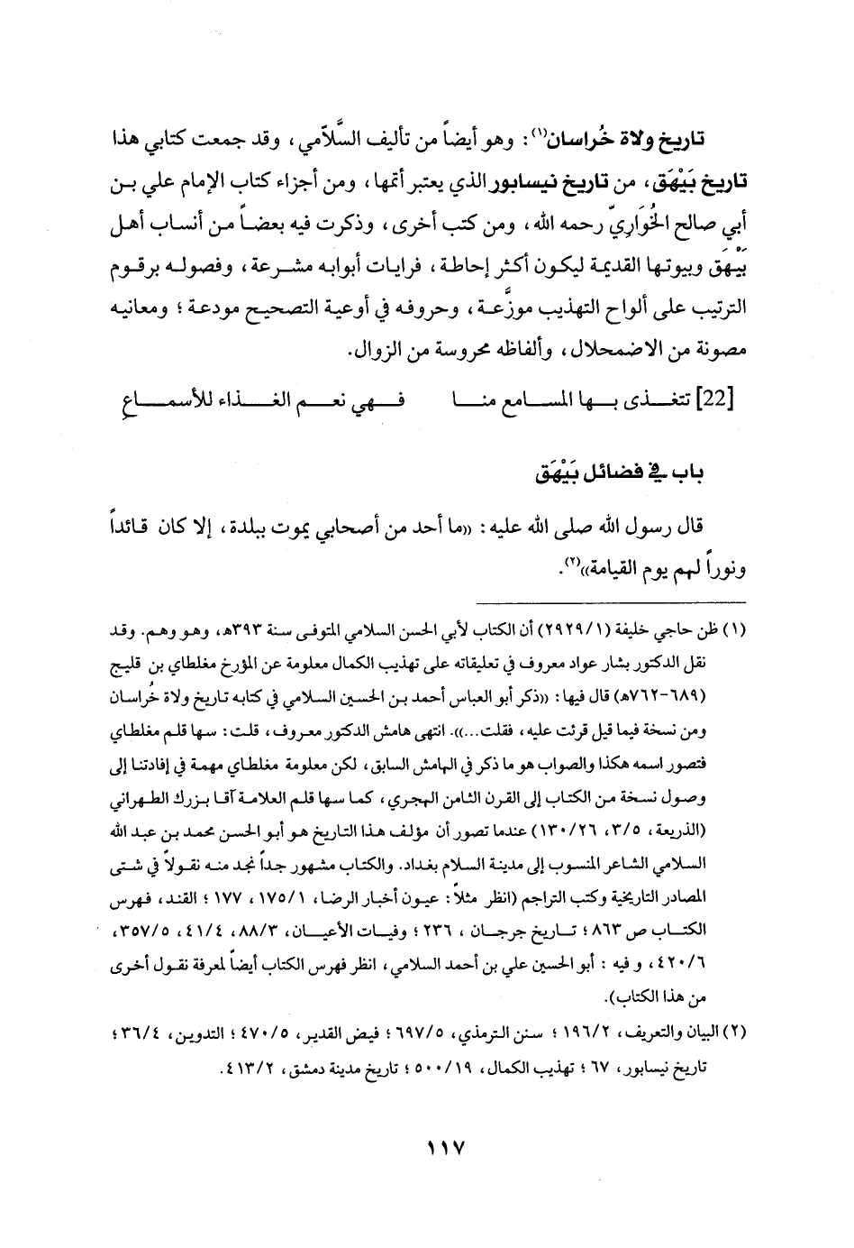 تاريخ ولاة خراسان «1» : وهو أيضا من تأليف السّلامي، وقد جمعت كتابي هذا تاريخ بيهق، من تاريخ نيسابور الذي يعتبر أتمها، ومن أجزاء كتاب الإمام علي بن أبي صالح الخواريّ رحمه الله، ومن كتب أخرى، وذكرت فيه بعضا من أنساب أهل بيهق وبيوتها القديمة ليكون أكثر إحاطة، فرايات أبوابه مشرعة، وفصوله برقوم الترتيب على ألواح التهذيب موزّعة، وحروفه في أوعية التصحيح مودعة؛ ومعانيه مصونة من الاضمحلال، وألفاظه محروسة من الزوال.