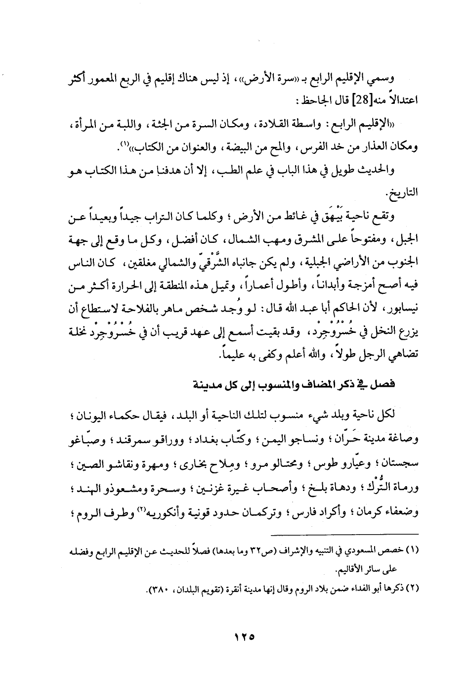 وسمي الإقليم الرابع ب «سرة الأرض» ، إذ ليس هناك إقليم في الربع المعمور أكثر اعتدالا منه [28] قال الجاحظ: