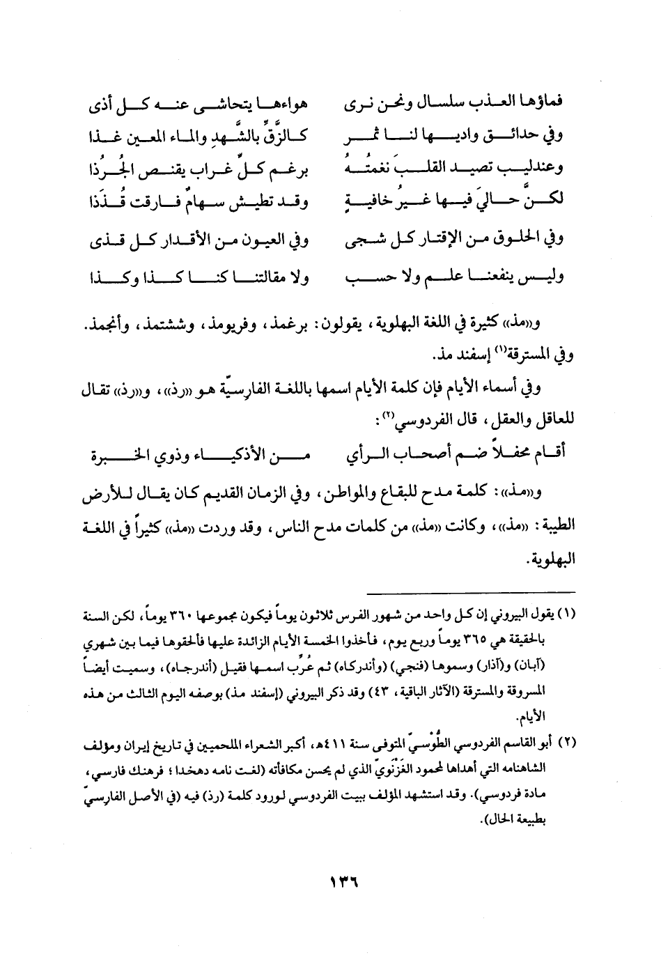 وفي أسماء الأيام فإن كلمة الأيام اسمها باللغة الفارسيّة هو «رذ» ، و «رذ» تقال للعاقل والعقل، قال الفردوسي «2» :