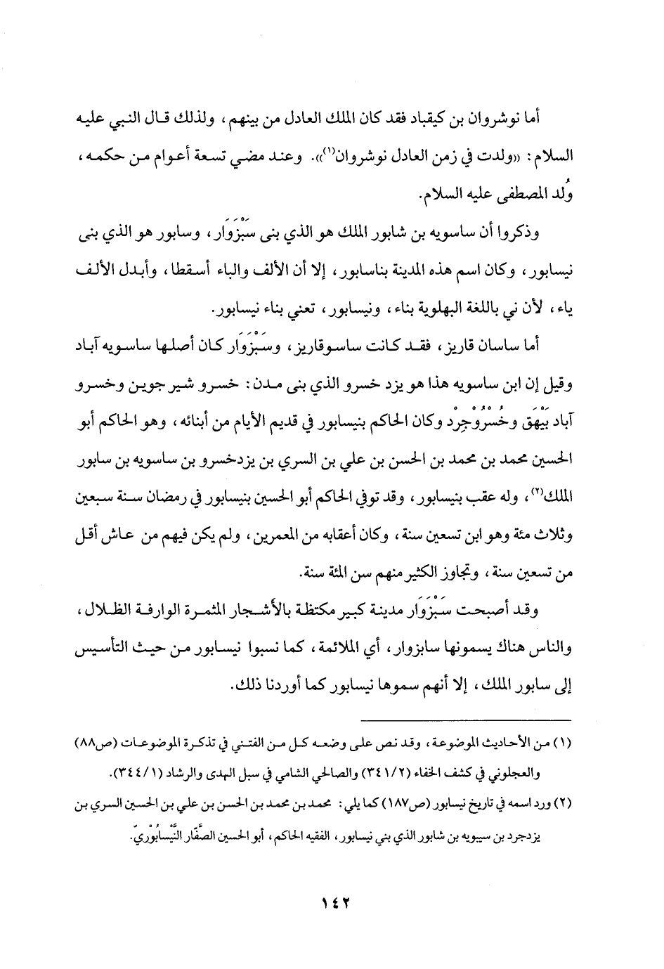 أما ساسان قاريز، فقد كانت ساسوقاريز، وسبزوار كان أصلها ساسويه آباد وقيل إن ابن ساسويه هذا هو يزد خسرو الذي بنى مدن: خسرو شير جوين وخسرو آباد بيهق وخسرو جرد وكان الحاكم بنيسابور في قديم الأيام من أبنائه، وهو الحاكم أبو الحسين محمد بن محمد بن الحسن بن علي بن السري بن يزد خسرو بن ساسويه بن سابور الملك «2» ، وله عقب بنيسابور، وقد توفي الحاكم أبو الحسين بنيسابور في رمضان سنة سبعين وثلاث مئة وهو ابن تسعين سنة، وكان أعقابه من المعمرين، ولم يكن فيهم من عاش أقل من تسعين سنة، وتجاوز الكثير منهم سن المئة سنة.