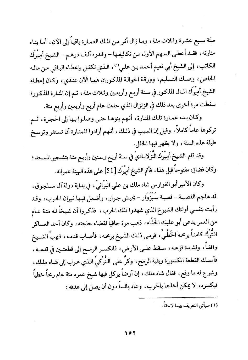 سنة سبع عشرة وثلاث مئة، وما زال أثر من تلك العمارة باقيا إلى الآن، أما بناء منارته، فقد أعطى السهم الأول من تكاليفها- وقدره ألف درهم- الشيخ أميرك الكاتب، إلى الشيخ أبي نعيم أحمد بن علي «1» ، الذي تكفل بإعطاء الباقي من ماله الخاص، وصك التسليم، وورقة الحوالة المذكوران هما الآن عندي، وكان إعطاء الشيخ أميرك المال المذكور في سنة أربع وأربعين وثلاث مئة، ثم إن المنارة المذكورة سقطت مرة أخرى بعد ذلك في الزلزال الذي حدث عام أربع وأربعين وأربع مئة.