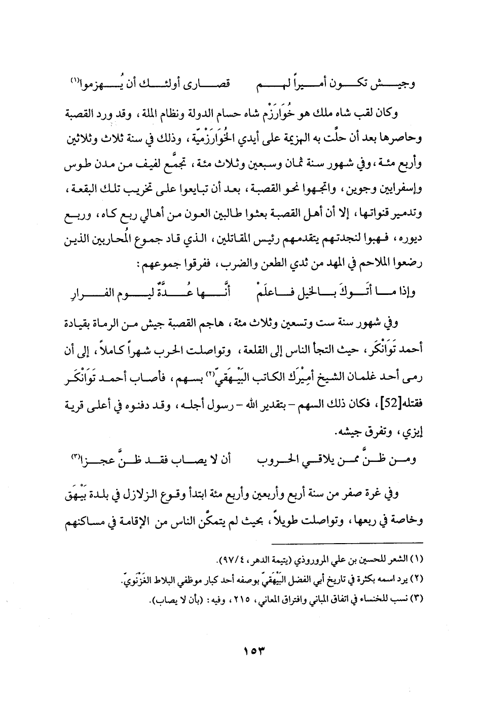 وفي شهور سنة ست وتسعين وثلاث مئة، هاجم القصبة جيش من الرماة بقيادة أحمد توانكر، حيث التجأ الناس إلى القلعة، وتواصلت الحرب شهرا كاملا، إلى أن رمى أحد غلمان الشيخ أميرك الكاتب البيهقيّ «2» بسهم، فأصاب أحمد توانكر فقتله [52] ، فكان ذلك السهم- بتقدير الله- رسول أجله، وقد دفنوه في أعلى قرية إيزي، وتفرق جيشه.