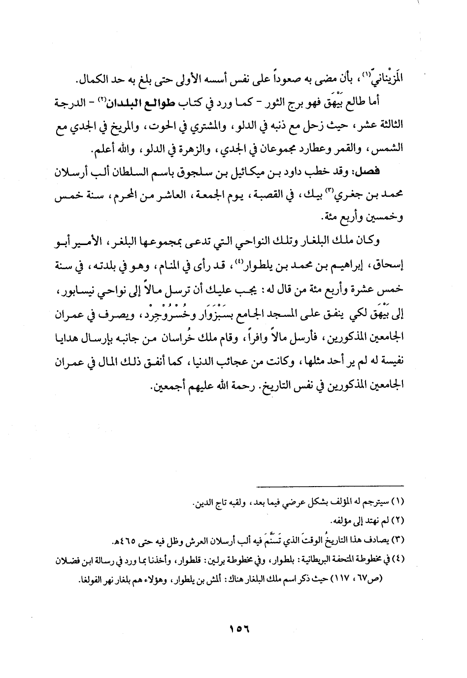 وكان ملك البلغار وتلك النواحي التي تدعى بمجموعها البلغر، الأمير أبو إسحاق، إبراهيم بن محمد بن يلطوار «4» ، قد رأى في المنام، وهو في بلدته، في سنة خمس عشرة وأربع مئة من قال له: يجب عليك أن ترسل مالا إلى نواحي نيسابور، إلى بيهق لكي ينفق على المسجد الجامع بسبزوار وخسروجرد، ويصرف في عمران الجامعين المذكورين، فأرسل مالا وافرا، وقام ملك خراسان من جانبه بإرسال هدايا نفيسة له لم ير أحد مثلها، وكانت من عجائب الدنيا، كما أنفق ذلك المال في عمران الجامعين المذكورين في نفس التاريخ. رحمة الله عليهم أجمعين.