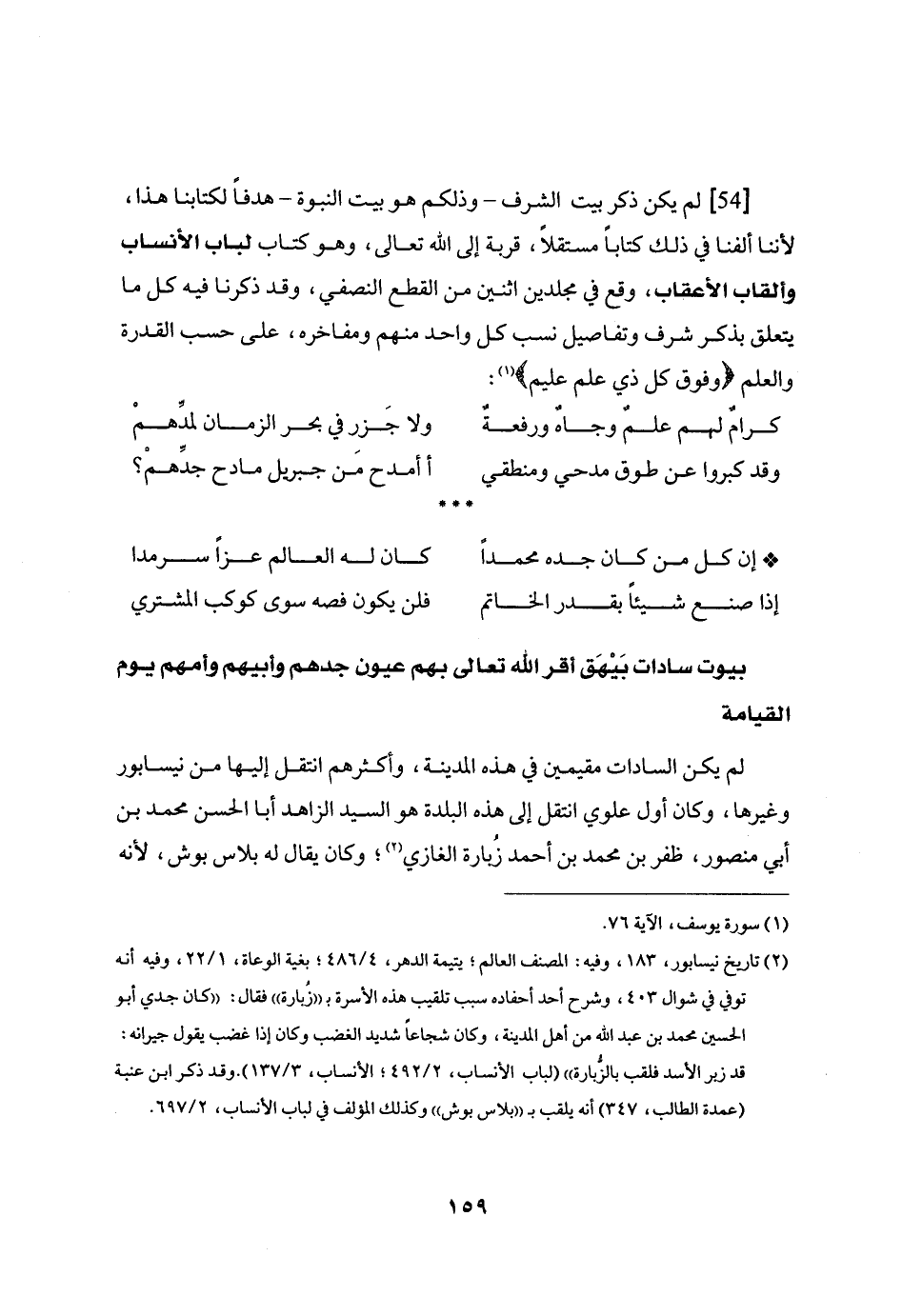 [54] لم يكن ذكر بيت الشرف- وذلكم هو بيت النبوة- هدفا لكتابنا هذا، لأننا ألفنا في ذلك كتابا مستقلا، قربة إلى الله تعالى، وهو كتاب لباب الأنساب وألقاب الأعقاب، وقع في مجلدين اثنين من القطع النصفي، وقد ذكرنا فيه كل ما يتعلق بذكر شرف وتفاصيل نسب كل واحد منهم ومفاخره، على حسب القدرة والعلم وَفَوْقَ كُلِّ ذِي عِلْمٍ عَلِيمٌ