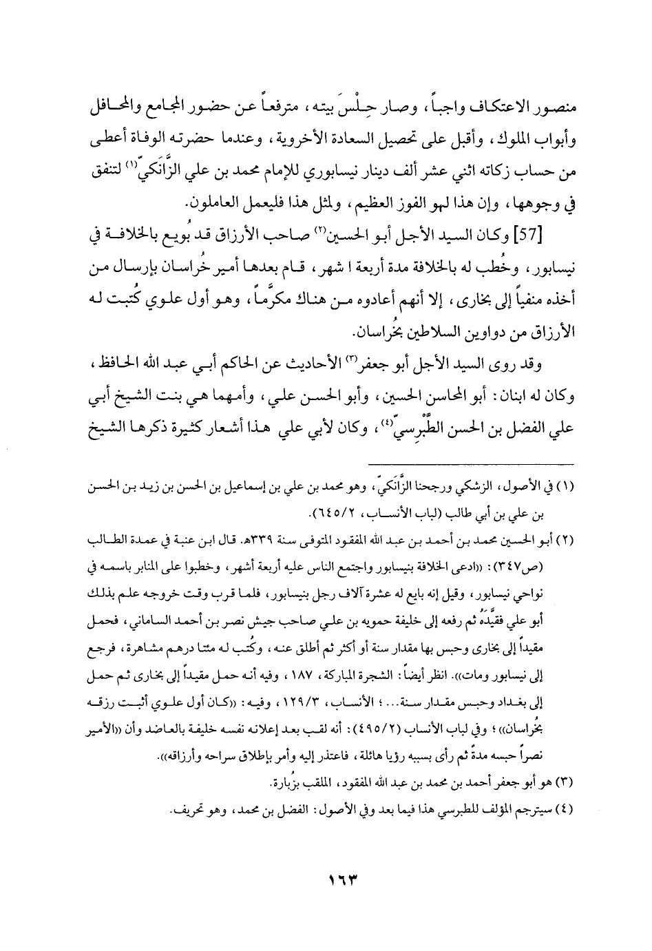 [57] وكان السيد الأجل أبو الحسين «2» صاحب الأرزاق قد بويع بالخلافة في نيسابور، وخطب له بالخلافة مدة أربعة اشهر، قام بعدها أمير خراسان بإرسال من أخذه منفيا إلى بخارى، إلا أنهم أعادوه من هناك مكرّما، وهو أول علوي كتبت له الأرزاق من دواوين السلاطين بخراسان.