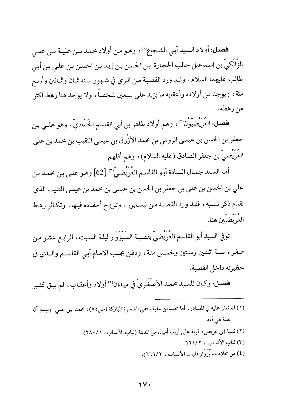 أما السيد جمال السادة أبو القاسم العريضيّ «3» [62] وهو علي بن محمد بن علي بن الحسن بن علي بن جعفر بن الحسن بن عيسى بن محمد بن عيسى النقيب الذي تقدم ذكر نسبه، فقد ورد القصبة من نيسابور، وتزوج أحفاده فيها، وتكاثر رهط العريضيّين هنا.
