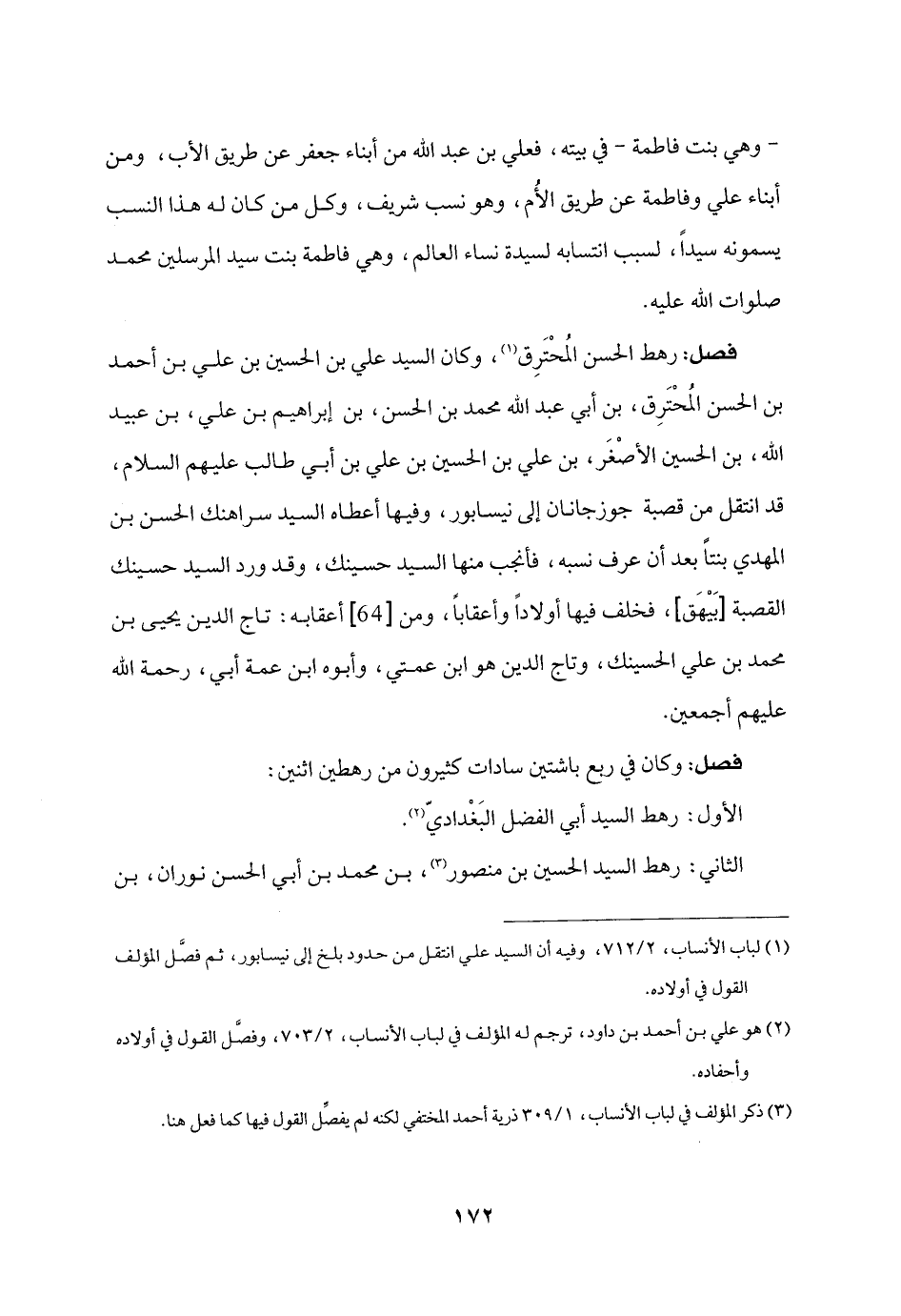 فصل: رهط الحسن المحترق «1» ، وكان السيد علي بن الحسين بن علي بن أحمد بن الحسن المحترق، بن أبي عبد الله محمد بن الحسن، بن إبراهيم بن علي، بن عبيد الله، بن الحسين الأصغر، بن علي بن الحسين بن علي بن أبي طالب عليهم السلام، قد انتقل من قصبة جوزجانان إلى نيسابور، وفيها أعطاه السيد سراهنك الحسن بن المهدي بنتا بعد أن عرف نسبه، فأنجب منها السيد حسينك، وقد ورد السيد حسينك القصبة [بيهق] ، فخلف فيها أولادا وأعقابا، ومن [64] أعقابه: تاج الدين يحيى بن محمد بن علي الحسينك، وتاج الدين هو ابن عمتي، وأبوه ابن عمة أبي، رحمة الله عليهم أجمعين.
