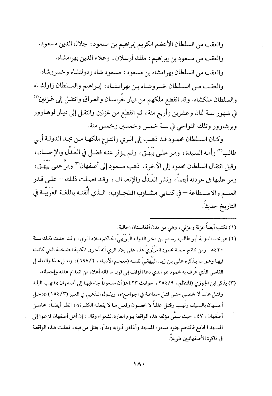 وكان السلطان محمود قد ذهب إلى الري وانتزع ملكها من مجد الدولة أبي طالب «2» وأمه السيدة، ومر على بيهق، ولم يؤثر عنه فضل في العدل والإحسان، وقبل انتقال السلطان محمود إلى الآخرة، ذهب مسعود إلى أصفهان «3» ومرّ على بيهق، ومر عليها في عودته أيضا، ونشر العدل والإنصاف، وقد فصلت ذلك- على قدر العلم والاستطاعة- في كتابي مشارب التجارب، الذي ألّفته باللغة العربيّة في التاريخ حديثا.