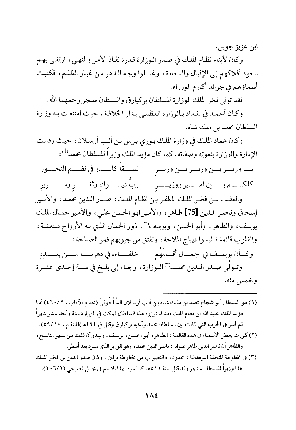 وكان لأبناء نظام الملك في صدر الوزارة قدرة نفاذ الأمر والنهي، ارتقى بهم سعود أفلاكهم إلى الإقبال والسعادة، وغسلوا وجه الدهر من غبار الظلم، فكتبت أسماؤهم في جرائد أكارم الوزراء.