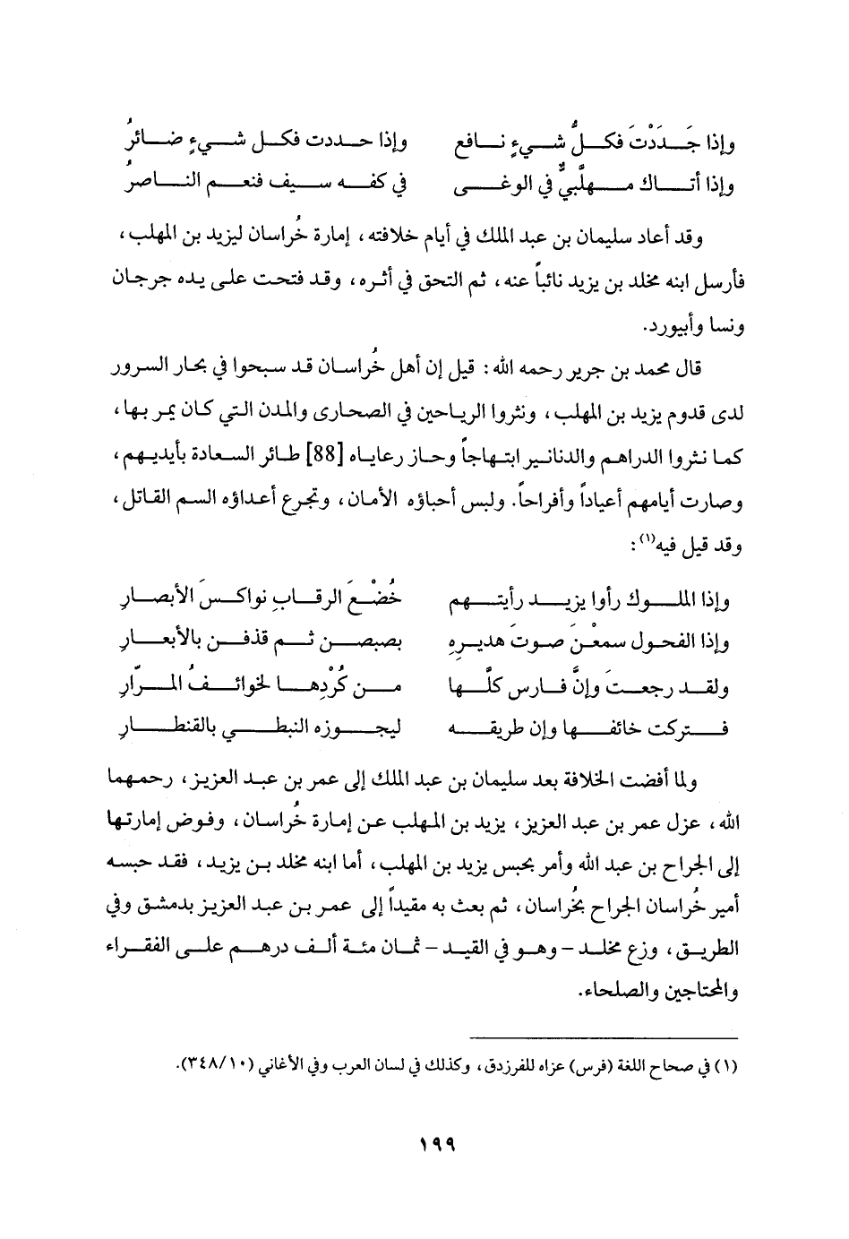 قال محمد بن جرير رحمه الله: قيل إن أهل خراسان قد سبحوا في بحار السرور لدى قدوم يزيد بن المهلب، ونثروا الرياحين في الصحارى والمدن التي كان يمر بها، كما نثروا الدراهم والدنانير ابتهاجا وحاز رعاياه [88] طائر السعادة بأيديهم، وصارت أيامهم أعيادا وأفراحا. ولبس أحباؤه الأمان، وتجرع أعداؤه السم القاتل، وقد قيل فيه «1» :