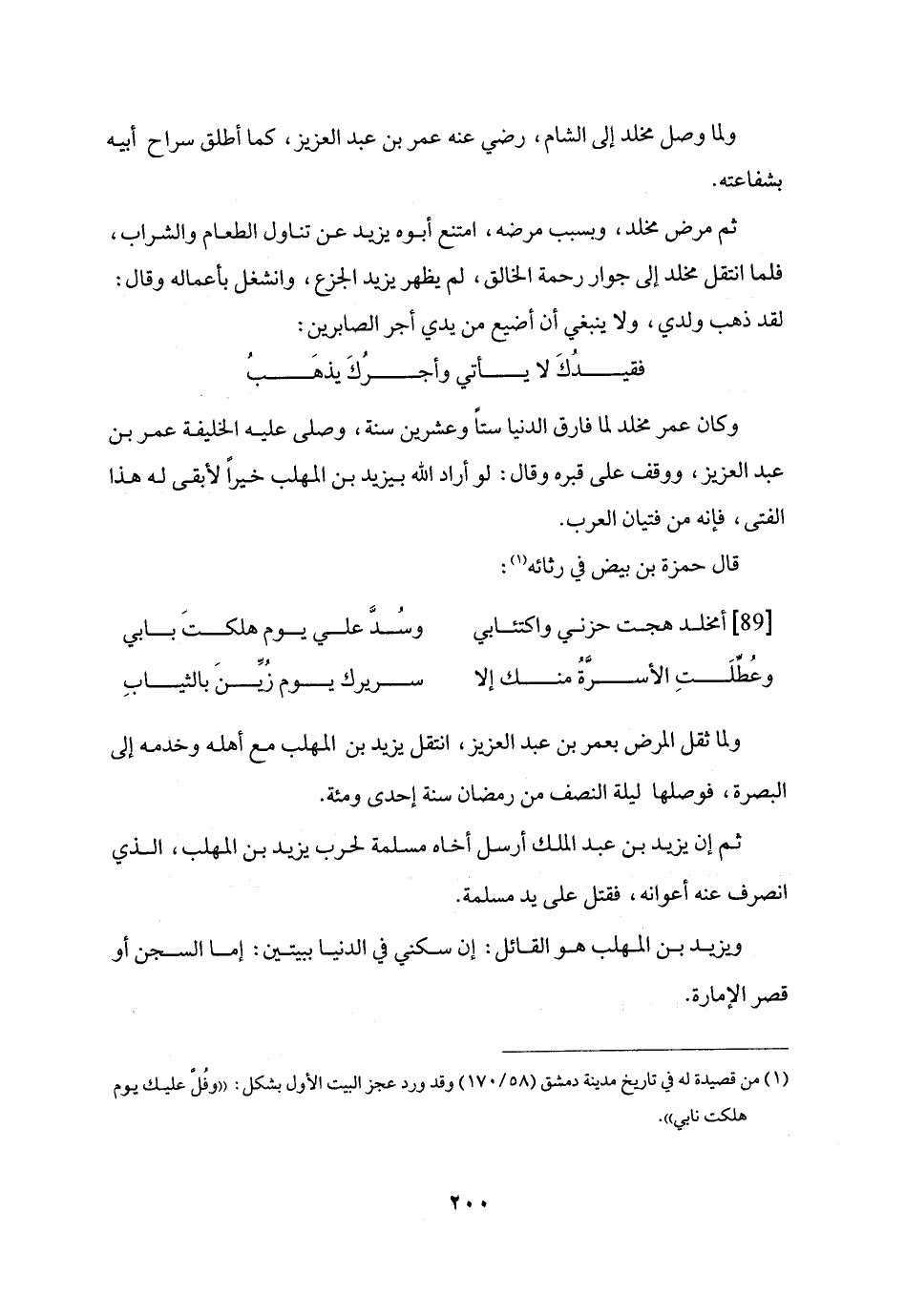وكان عمر مخلد لما فارق الدنيا ستا وعشرين سنة، وصلى عليه الخليفة عمر بن عبد العزيز، ووقف على قبره وقال: لو أراد الله بيزيد بن المهلب خيرا لأبقى له هذا الفتى، فإنه من فتيان العرب.