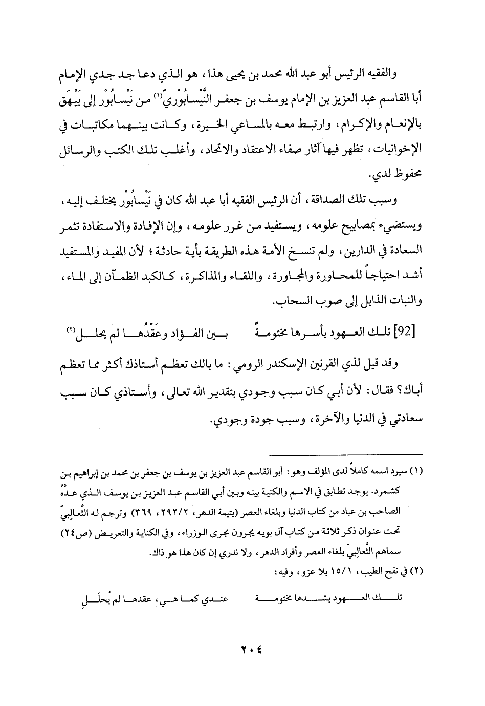 والفقيه الرئيس أبو عبد الله محمد بن يحيى هذا، هو الذي دعا جد جدي الإمام أبا القاسم عبد العزيز بن الإمام يوسف بن جعفر النّيسابوريّ «1» من نيسابور إلى بيهق بالإنعام والإكرام، وارتبط معه بالمساعي الخيرة، وكانت بينهما مكاتبات في الإخوانيات، تظهر فيها آثار صفاء الاعتقاد والاتحاد، وأغلب تلك الكتب والرسائل محفوظ لدي.