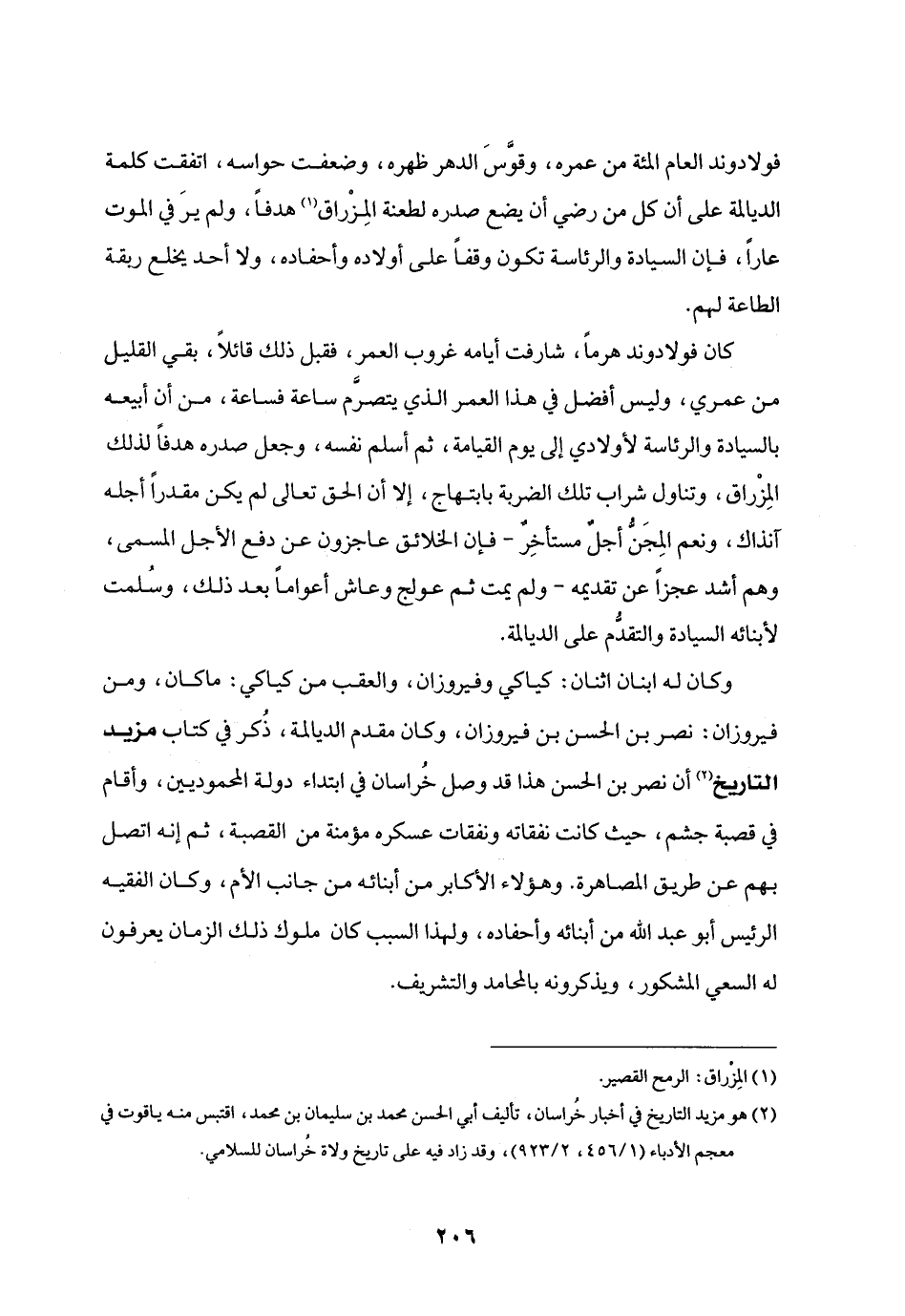 وكان له ابنان اثنان: كياكي وفيروزان، والعقب من كياكي: ما كان، ومن فيروزان: نصر بن الحسن بن فيروزان، وكان مقدم الديالمة، ذكر في كتاب مزيد التاريخ «2» أن نصر بن الحسن هذا قد وصل خراسان في ابتداء دولة المحموديين، وأقام في قصبة جشم، حيث كانت نفقاته ونفقات عسكره مؤمنة من القصبة، ثم إنه اتصل بهم عن طريق المصاهرة. وهؤلاء الأكابر من أبنائه من جانب الأم، وكان الفقيه الرئيس أبو عبد الله من أبنائه وأحفاده، ولهذا السبب كان ملوك ذلك الزمان يعرفون له السعي المشكور، ويذكرونه بالمحامد والتشريف.