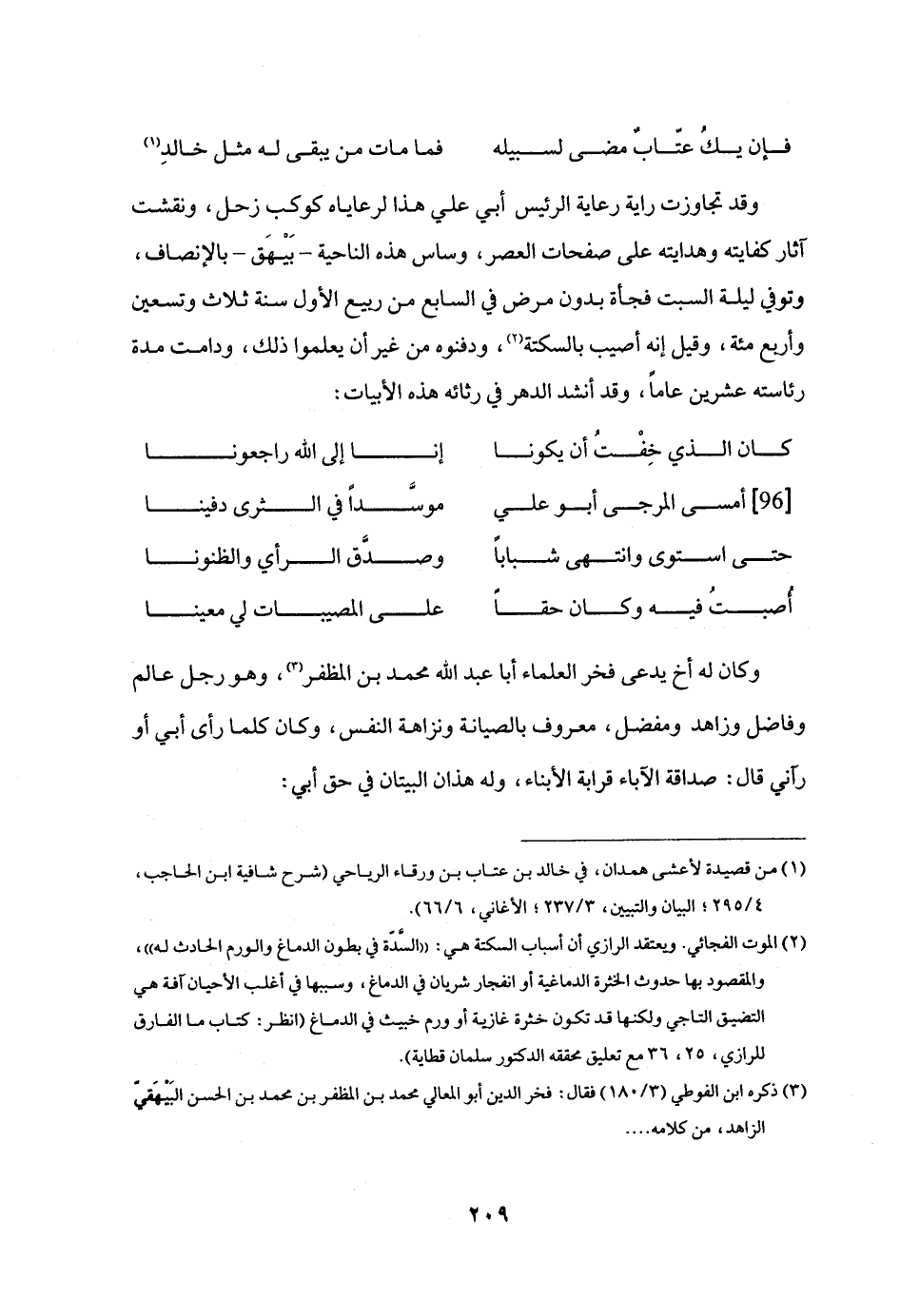 وقد تجاوزت راية رعاية الرئيس أبي علي هذا لرعاياه كوكب زحل، ونقشت آثار كفايته وهدايته على صفحات العصر، وساس هذه الناحية- بيهق- بالإنصاف، وتوفي ليلة السبت فجأة بدون مرض في السابع من ربيع الأول سنة ثلاث وتسعين وأربع مئة، وقيل إنه أصيب بالسكتة «2» ، ودفنوه من غير أن يعلموا ذلك، ودامت مدة رئاسته عشرين عاما، وقد أنشد الدهر في رثائه هذه الأبيات: