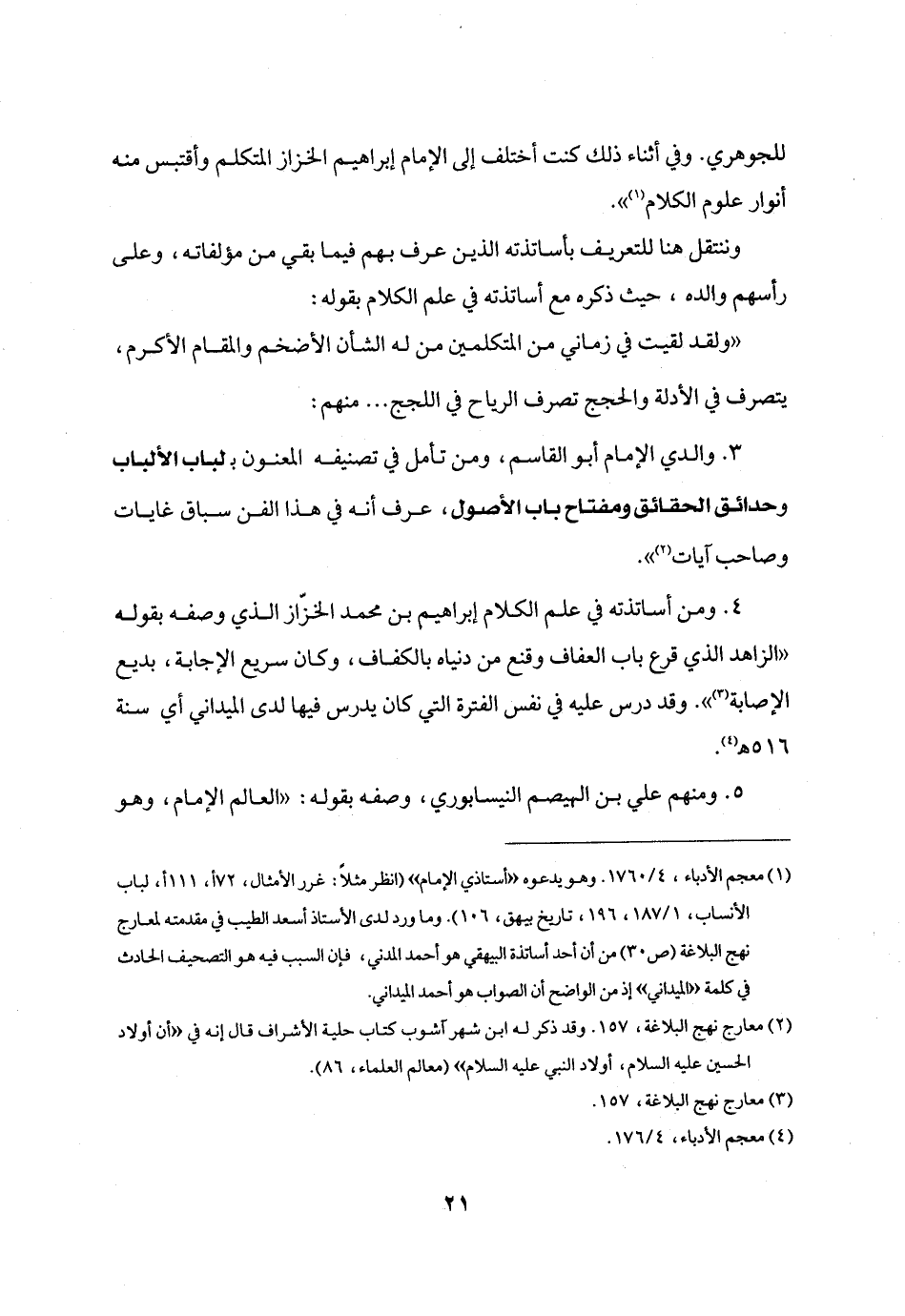 للجوهري. وفي أثناء ذلك كنت أختلف إلى الإمام إبراهيم الخزاز المتكلم وأقتبس منه أنوار علوم الكلام «1» » .