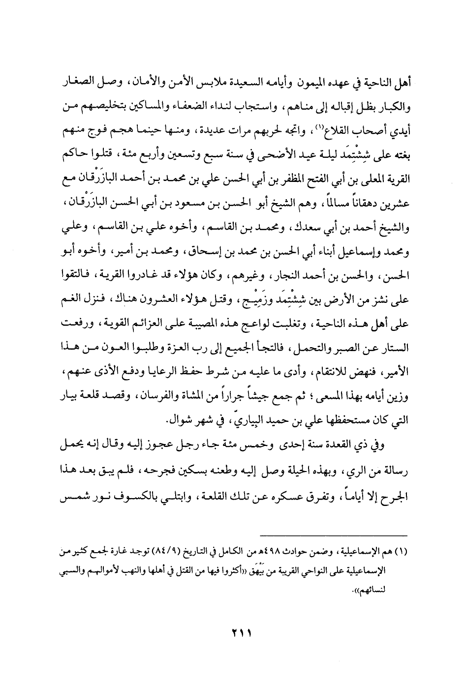 أهل الناحية في عهده الميمون وأيامه السعيدة ملابس الأمن والأمان، وصل الصغار والكبار بظل إقباله إلى مناهم، واستجاب لنداء الضعفاء والمساكين بتخليصهم من أيدي أصحاب القلاع «1» ، واتجه لحربهم مرات عديدة، ومنها حينما هجم فوج منهم بغته على ششتمد ليلة عيد الأضحى في سنة سبع وتسعين وأربع مئة، قتلوا حاكم القرية المعلى بن أبي الفتح المظفر بن أبي الحسن علي بن محمد بن أحمد البازرقان مع عشرين دهقانا مسالما، وهم الشيخ أبو الحسن بن مسعود بن أبي الحسن البازرقان، والشيخ أحمد بن أبي سعدك، ومحمد بن القاسم، وأخوه علي بن القاسم، وعلي ومحمد وإسماعيل أبناء أبي الحسن بن محمد بن إسحاق، ومحمد بن أمير، وأخوه أبو الحسن، والحسن بن أحمد النجار، وغيرهم، وكان هؤلاء قد غادروا القرية، فالتقوا على نشز من الأرض بين ششتمد وزميج، وقتل هؤلاء العشرون هناك، فنزل الغم على أهل هذه الناحية، وتغلبت لواعج هذه المصيبة على العزائم القوية، ورفعت الستار عن الصبر والتحمل، فالتجأ الجميع إلى رب العزة وطلبوا العون من هذا الأمير، فنهض للانتقام، وأدى ما عليه من شرط حظ الرعايا ودفع الأذى عنهم، وزين أيامه بهذا المسعى؛ ثم جمع جيشا جرارا من المشاة والفرسان، وقصد قلعة بيار التي كان مستحفظها علي بن حميد البياريّ، في شهر شوال.